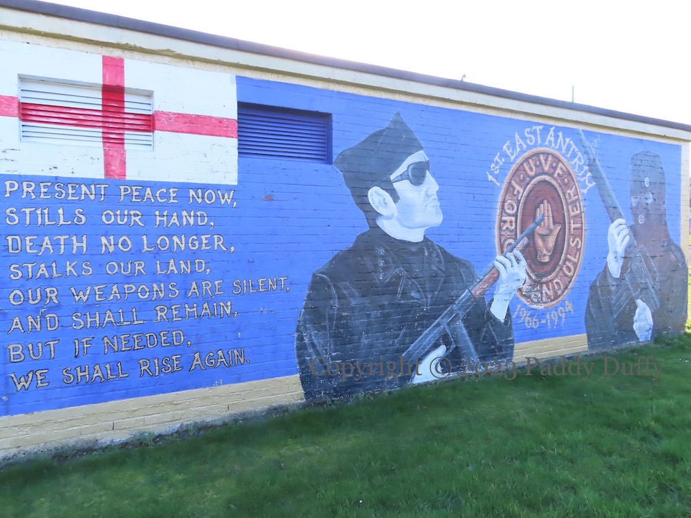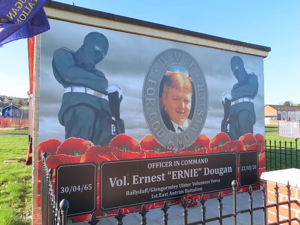 ‘Four Lads Had A Dream’ is the name of Rangers song (youtube) but here the dream is not “to start a team” in Glasgow but to start a flute band in Monkstown, Newtownabbey. The result of the efforts of the four men – John Black, Freddie Maltman, Brian Crothers, Trevor Wilson – was Monkstown YCV flute band (Fb), formed in 1974 and so celebrating its fiftieth anniversary this year, 2024. To mark the occasion, the band has installed the series of boards shown here along a low wall in Cloyne Crescent; it will also visit the Somme and play at the Last Post ceremony which takes place at eight every evening at the Menin Gate (web).