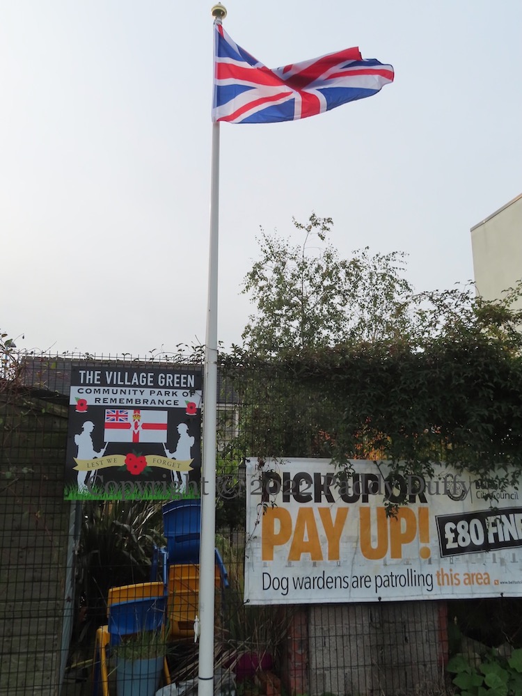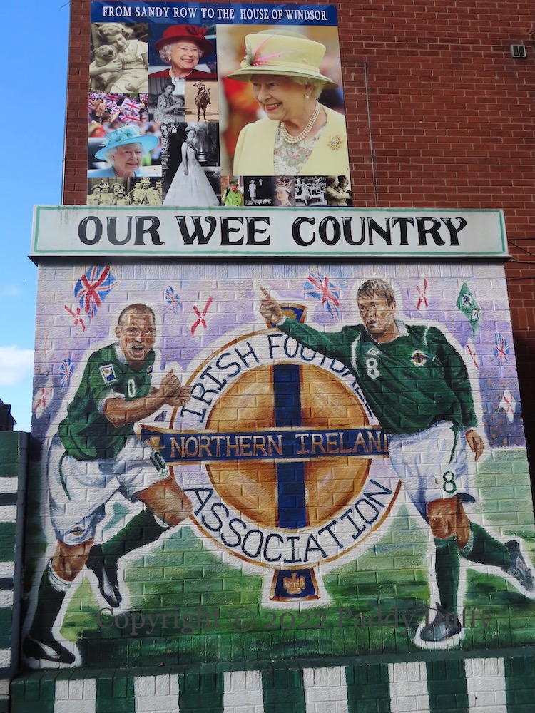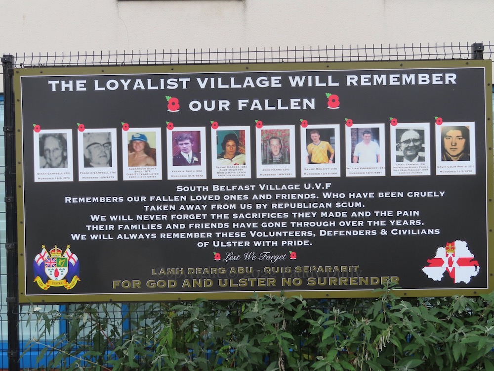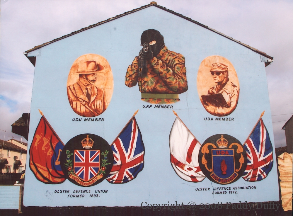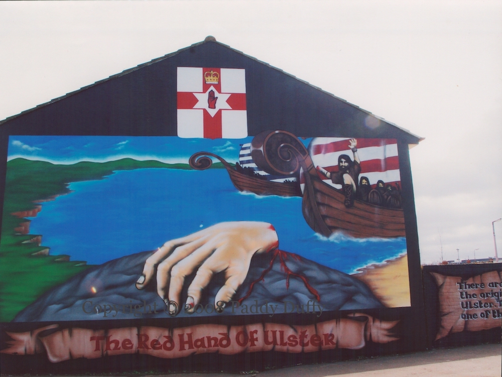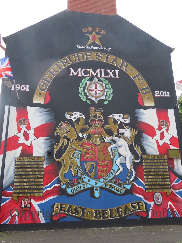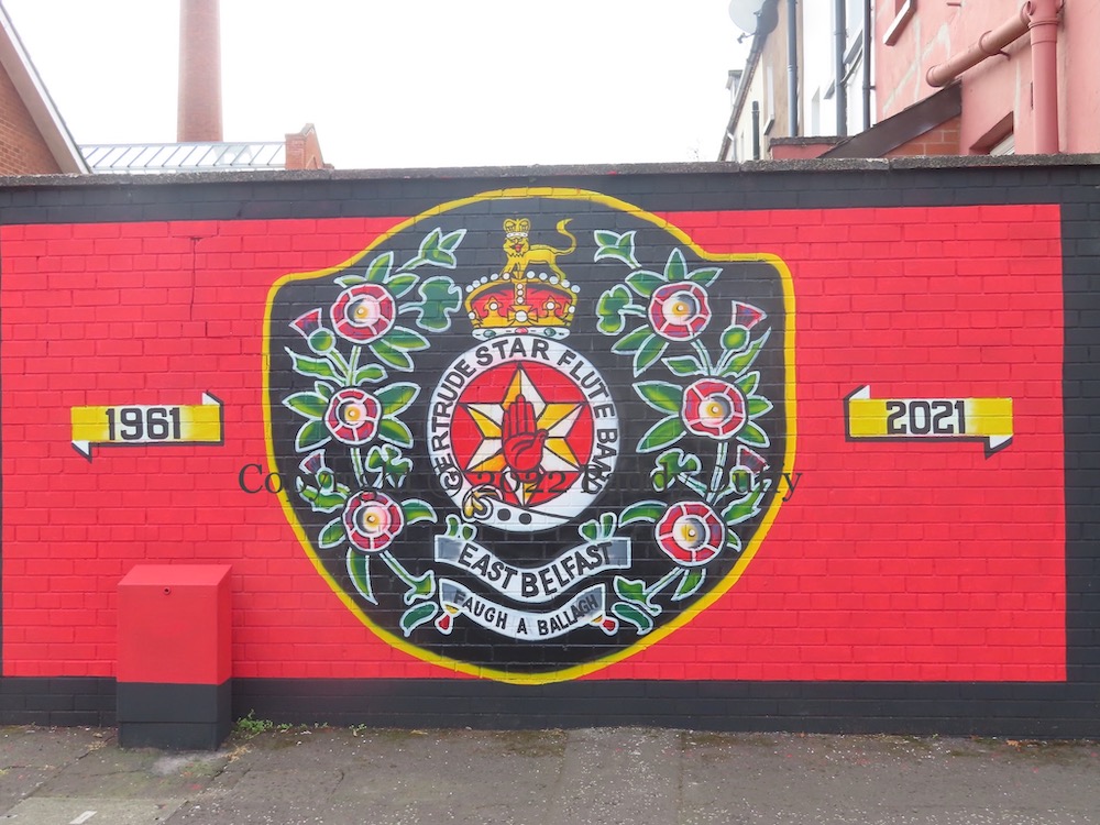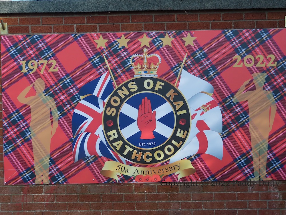 Sons Of Kai flute band (ig) re-formed in 2006 (youtube | Coin Talk) but here claims as its origin date “1972”. IWM gives the founding year as 1970, and quotes one of the founders, Bo Kerr, saying that the band was named after Danish soccer player Kai Johansen (WP), who played for Rangers from 1965-1970, and that the “tartan” gang (History Ireland) ‘Rathcoole KAI’ subsequently took its named from the band. Then (BelTel) and now (Irish News | Slugger) “KAI” is understood to stand for “Kill All Irish”. A 1982 image of the Rathcoole KAI “red devils” mural can be seen in the Ciaran McGowan collection at IWM.