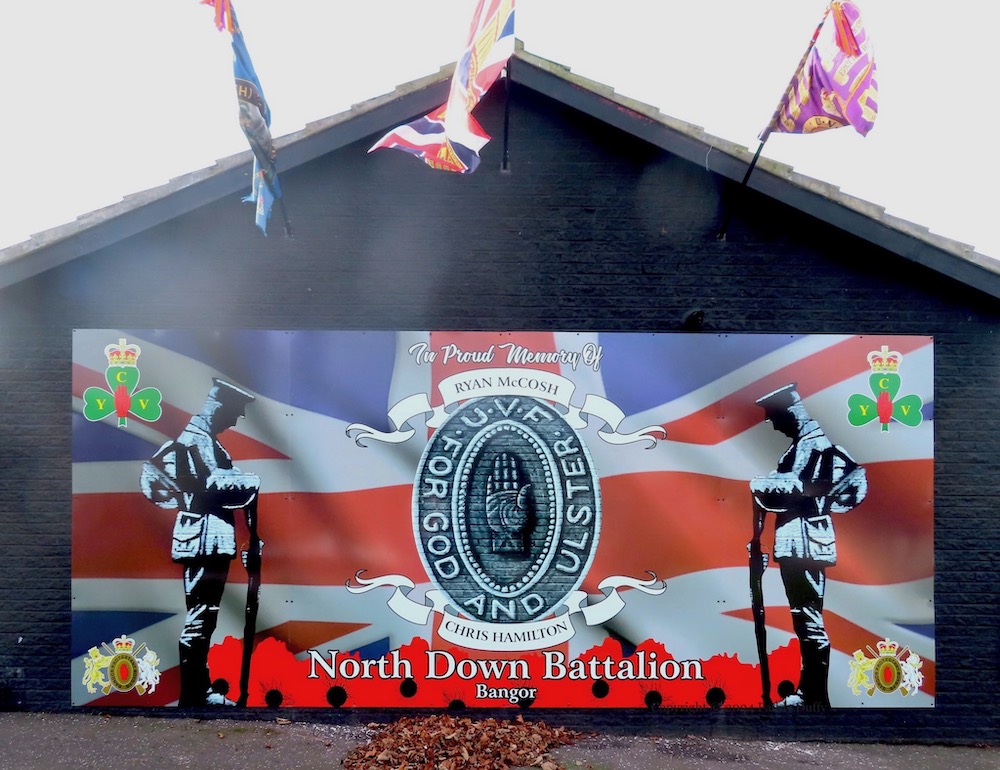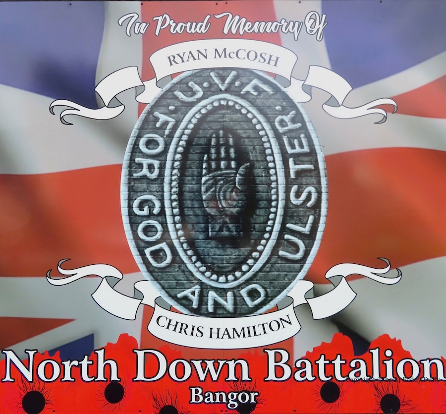 Here are two boards from Ballymacash celebrating the union with Britain and the centenary of Northern Ireland. The pair mark the western (above) and eastern (below) entrances to the estate (along with Loyalist Ballymacash). The estate is known for its large bonfire (see e.g. these images from 2018).