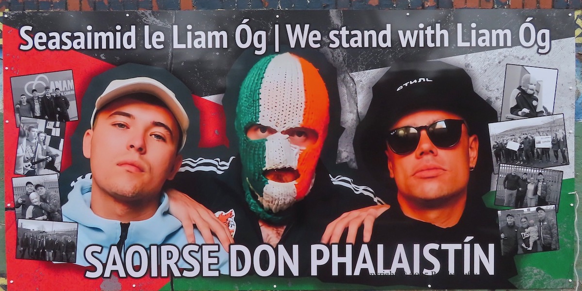 In the background is a Palestinian flag and “Saoırse don Phalaıstín” [Freedom for Palestine] is written along the bottom.