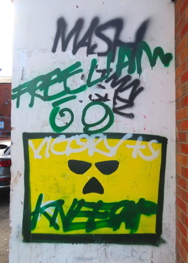 Kneecap were back in town opening for the Fontaines DC at Belfast Vital at the Boucher Road playing fields on Friday (BBC) (and an after-party at the Beehive) before zipping down to the Electric Picnic festival in Laois. At both concerts they were outspoken in their support for Palestinians in Gaza, as well as criticising the DUP, Alliance (Belfast Live), McDonald’s and Kemi Badenoch (Irish Examiner). In each of the past three years, the band has added to the wall at the corner of Hawthorn Street and Cavendish Street (see in order: Incendiary Device, England Get Out Of Ireland, and Kneecap’s Fine Art) and it is now full with the addition of “Free Palestine – Israel is committing a genocide against the Palestinian people” below the chimneys.
