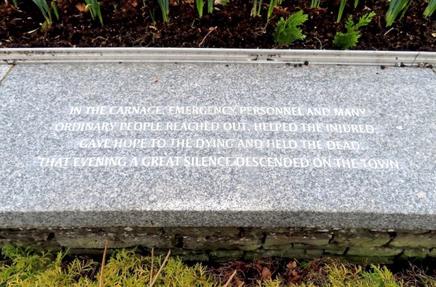 “Saturday 15 August 1998 at 3.10 PM. To honour and remember the 31 men, women and children who were killed, the hundreds injured and those whose lives were changed forever in the Omagh bomb. ‘The light shines in the darkness and the darkness has not overcome it’ (John 1.5)”