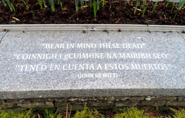 One of the stones reads “Bear in mind these dead/Coınnıgh ı gcuımhne na maırıbh seo/Tened en cuenta a estos muertos – (John Hewitt)”; two of the victims were Spanish.