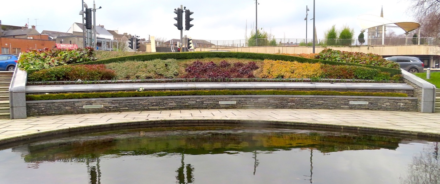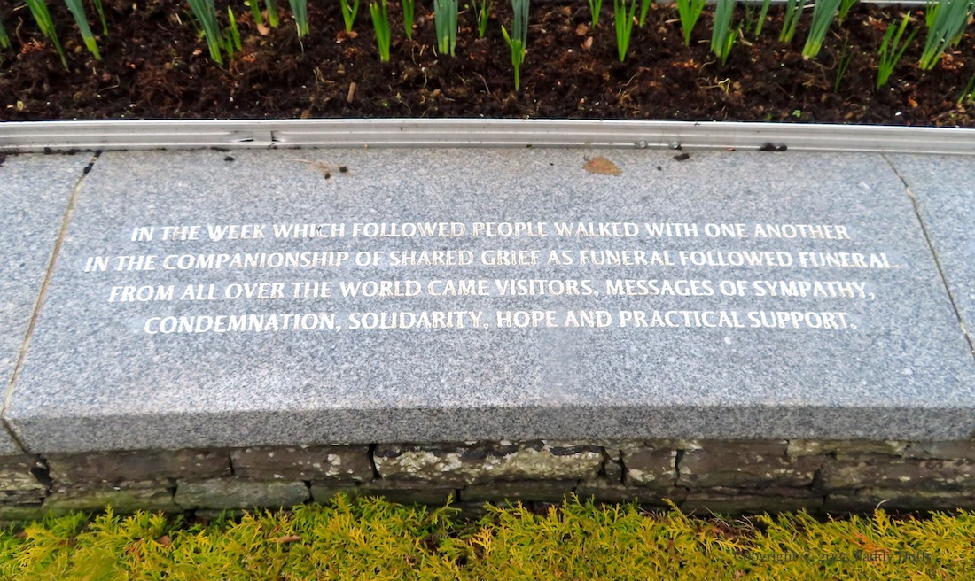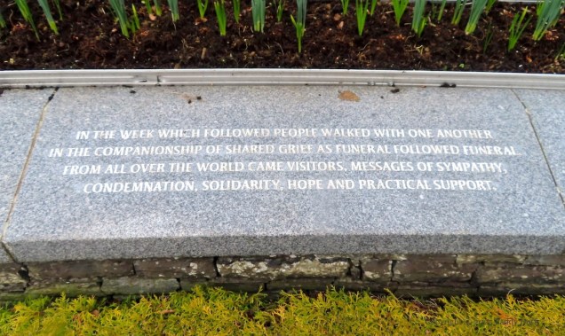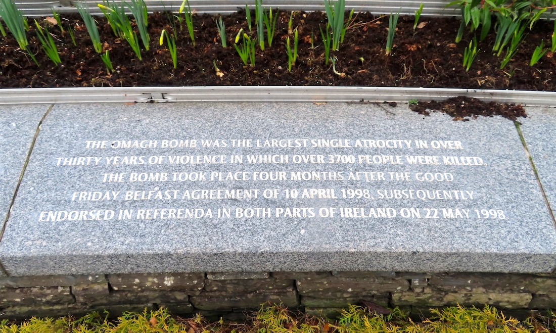 This memorial to the victims of the Omagh bombing is in a green-space along the Strule river about 300 metres (WP) from the spot where an RIRA car-bomb exploded on the afternoon of 15th of August 1998, killing twenty-nine people and injuring more than 200 others.