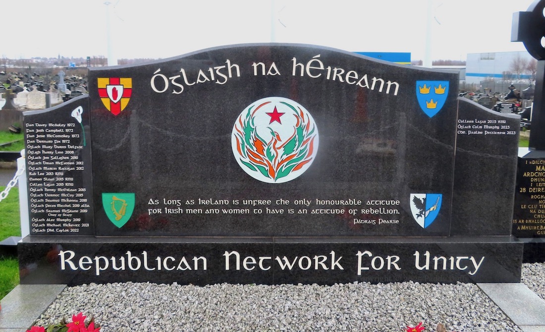 The stone features the phoenix and the lily, and the crests of the four provinces of Ireland. It was unveiled in 2023 and an image of it was used in an RNU board on the Falls Road.