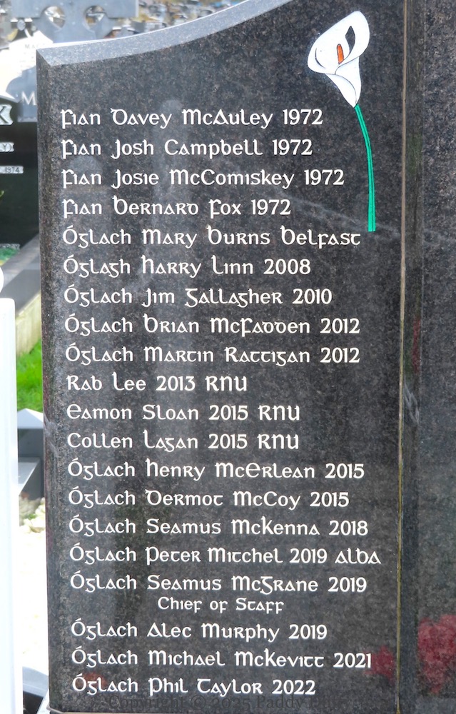 Among the volunteers listed are the four Ardoyne Fıanna who died in 1972 (commemorated in Ardoyne) and Michael McKevitt, founder and (alleged) chief of staff of the RIRA/Óglaıgh Na hÉıreann (WP) who died in 2021.