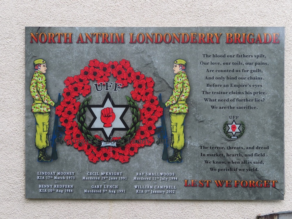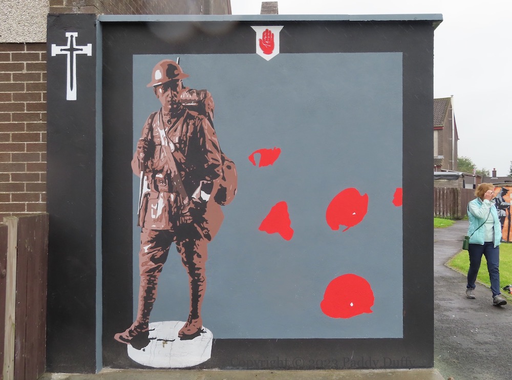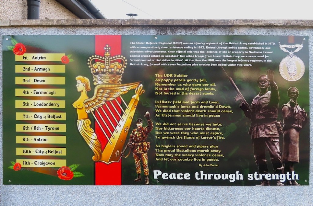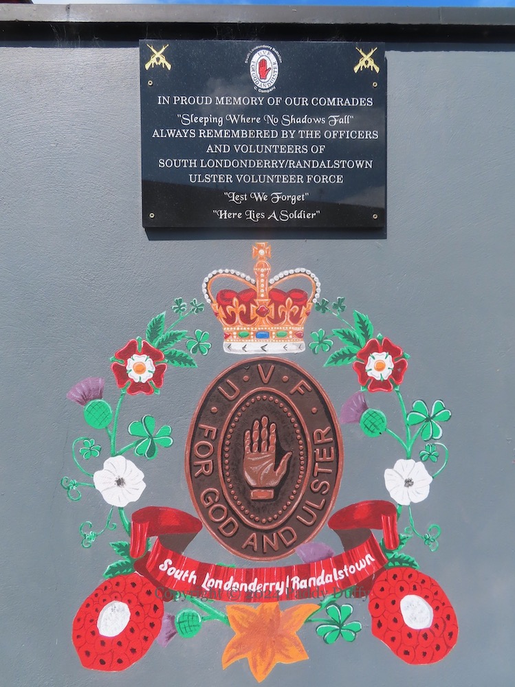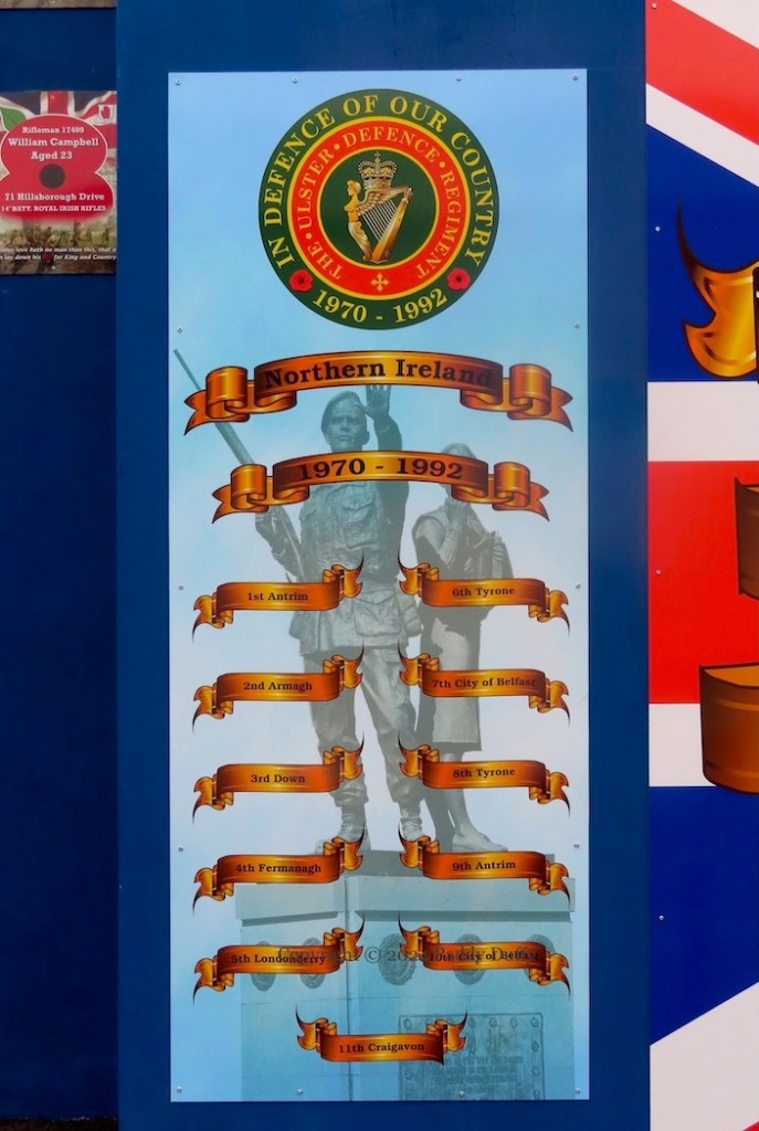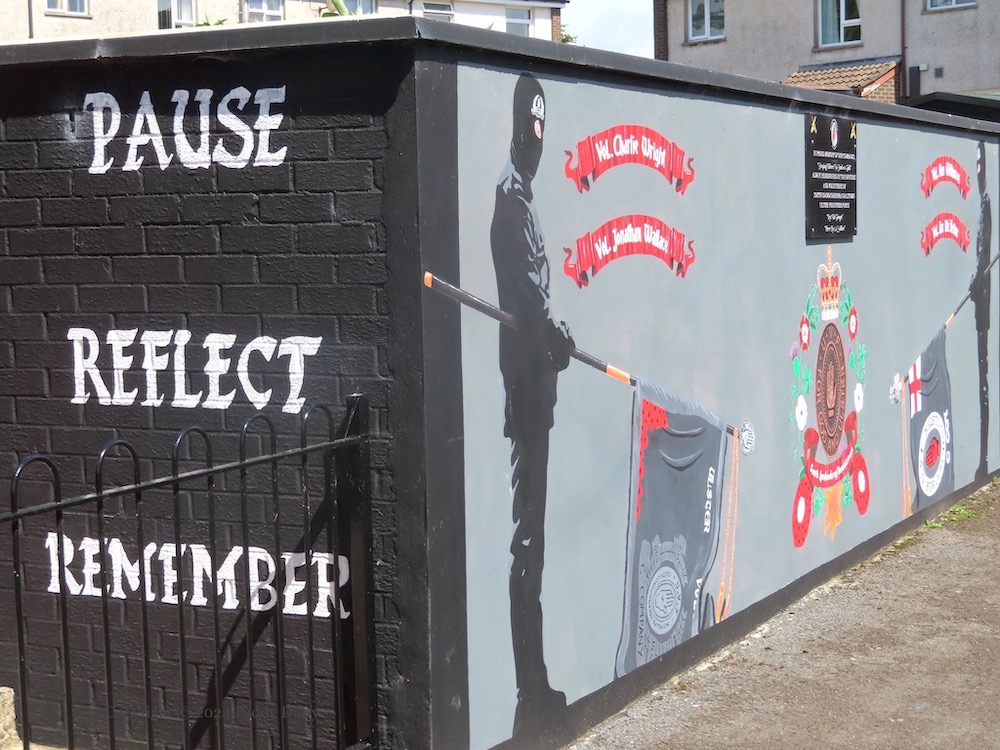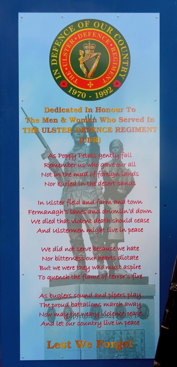 Here is a gallery of images from the wall behind the Shore Road ‘World Wars’ memorial (see Remembrance Sunday) which has a few new additions and re-ordered boards for this year’s commemorations. The main additions are the “Lest we forget” stencil shown above, and a large number of white crosses in the grass and along the fence bearing the emblem of the UDR. The UDR board has been moved from the slanted wall at the far left to what is now the central position on the wall.