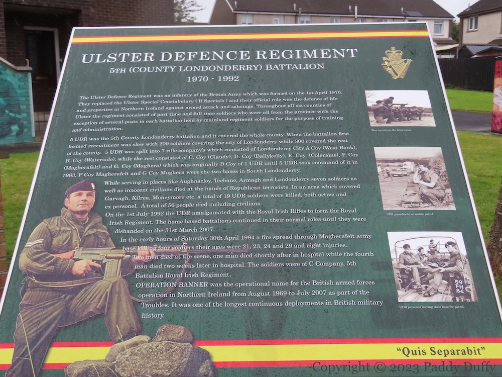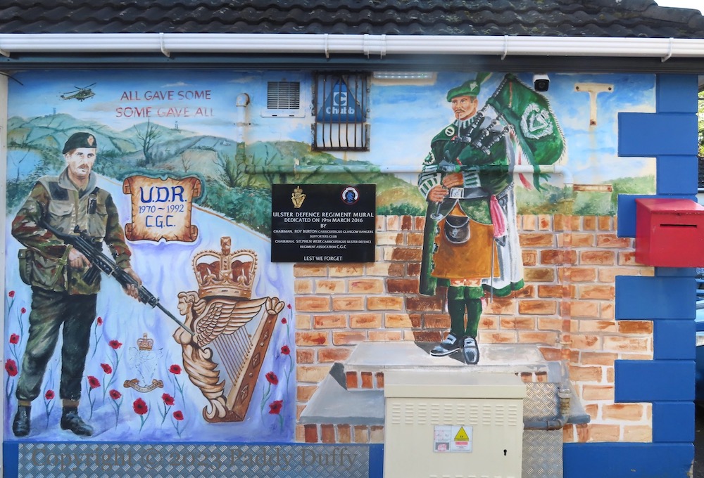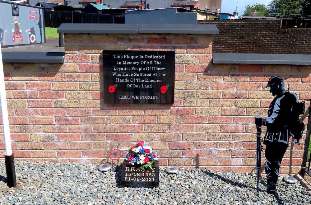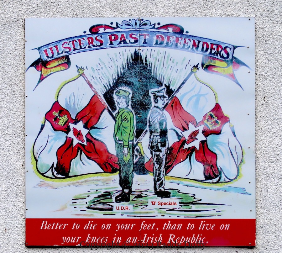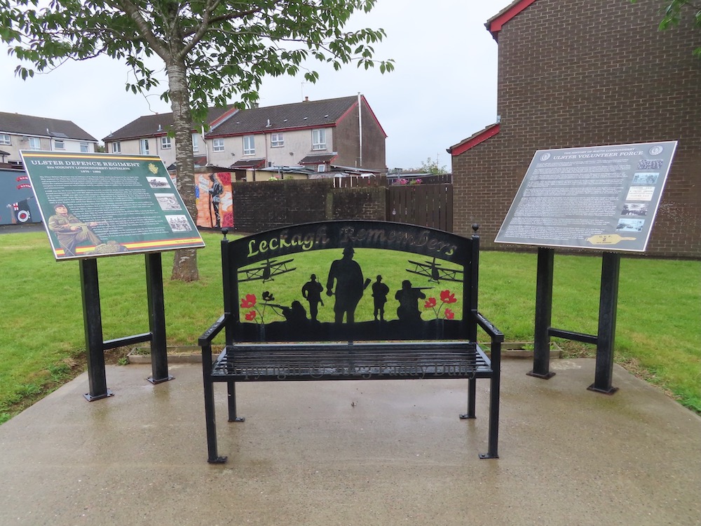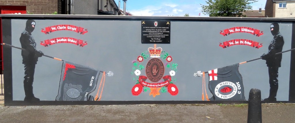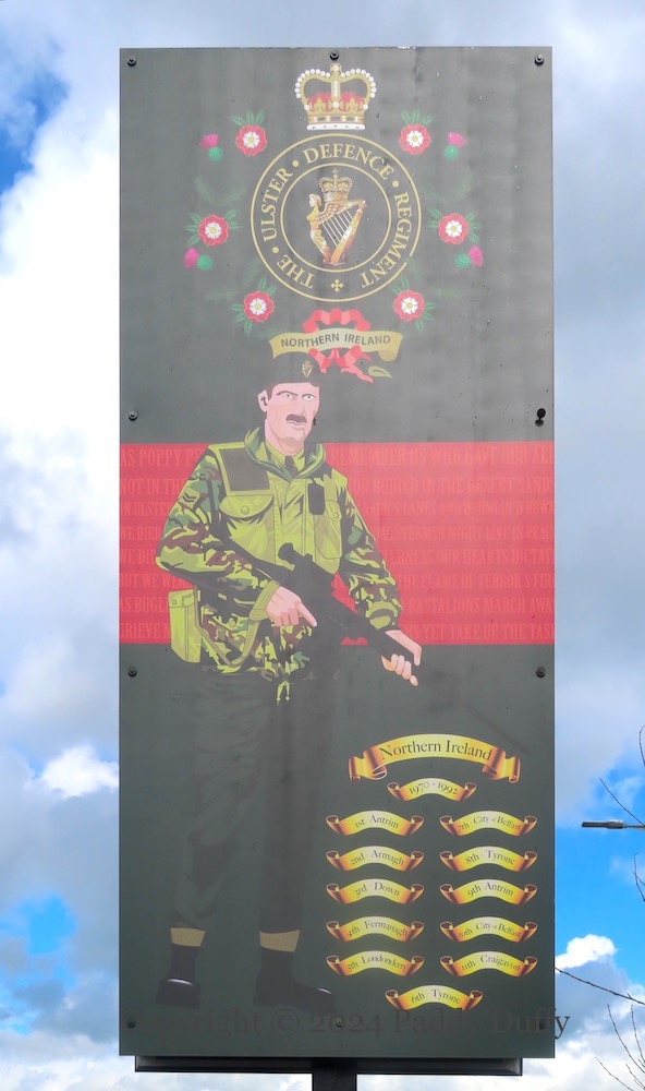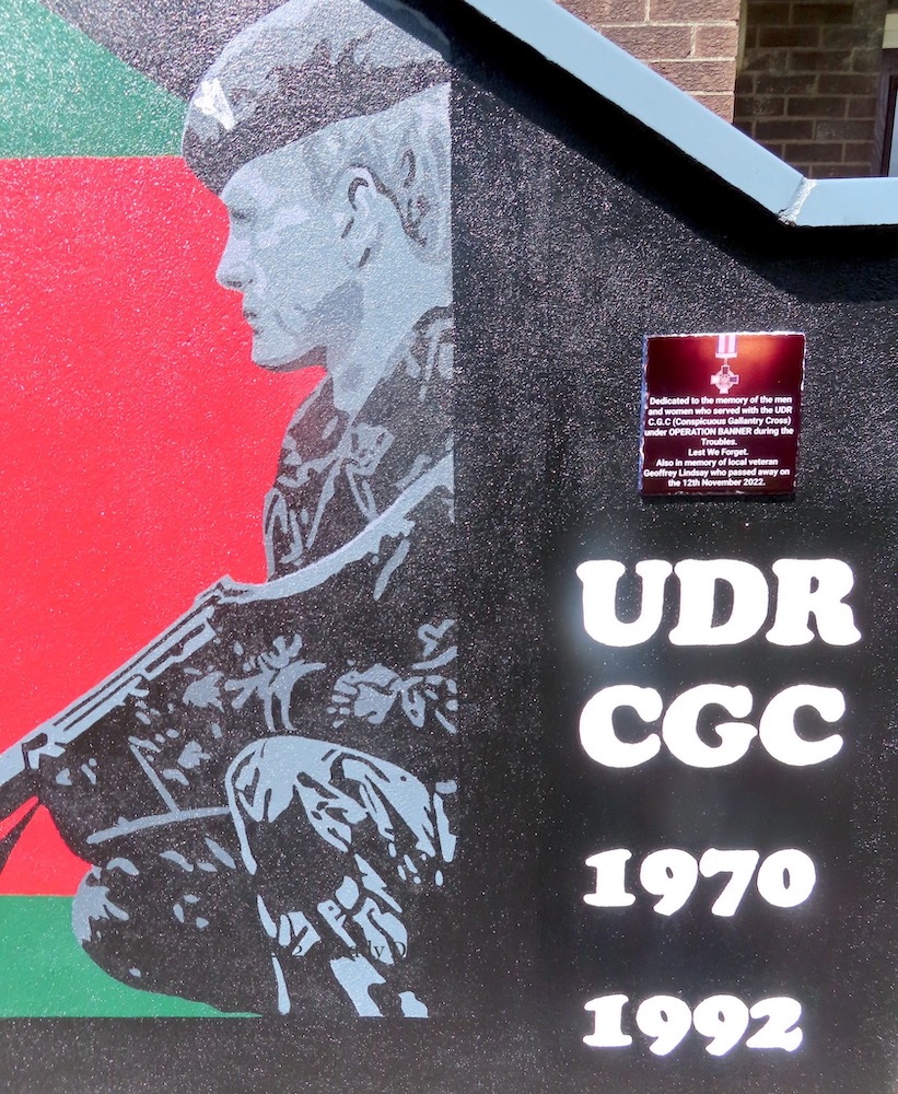 Here is a gallery of images from the wall behind the Shore Road ‘World Wars’ memorial (see Remembrance Sunday) which has a few new additions and re-ordered boards for this year’s commemorations. The main additions are the “Lest we forget” stencil shown above, and a large number of white crosses in the grass and along the fence bearing the emblem of the UDR. The UDR board has been moved from the slanted wall at the far left to what is now the central position on the wall.