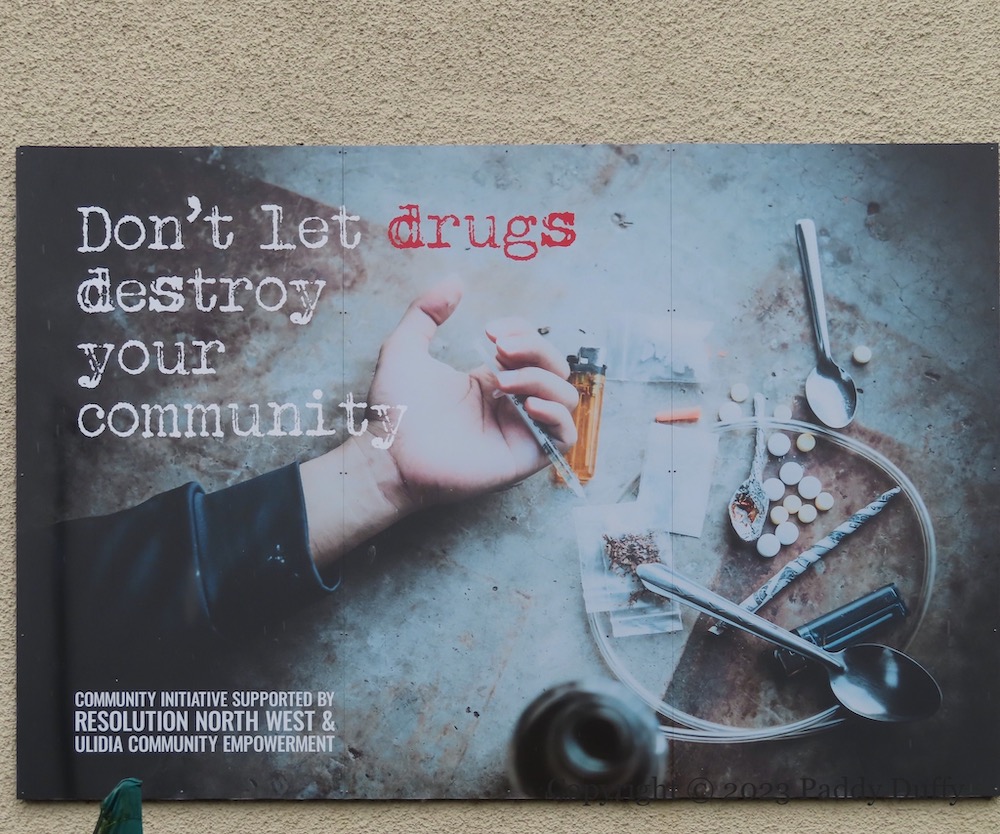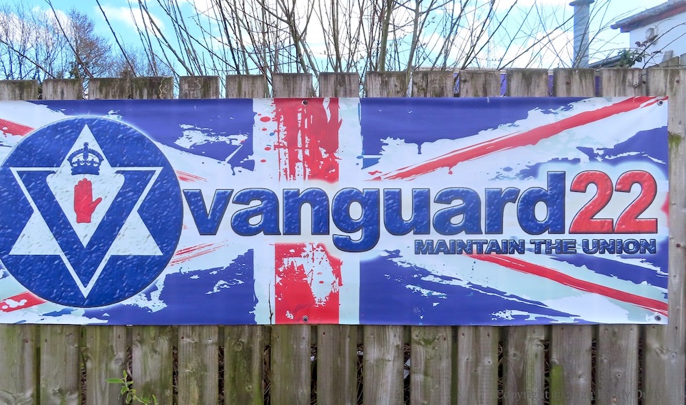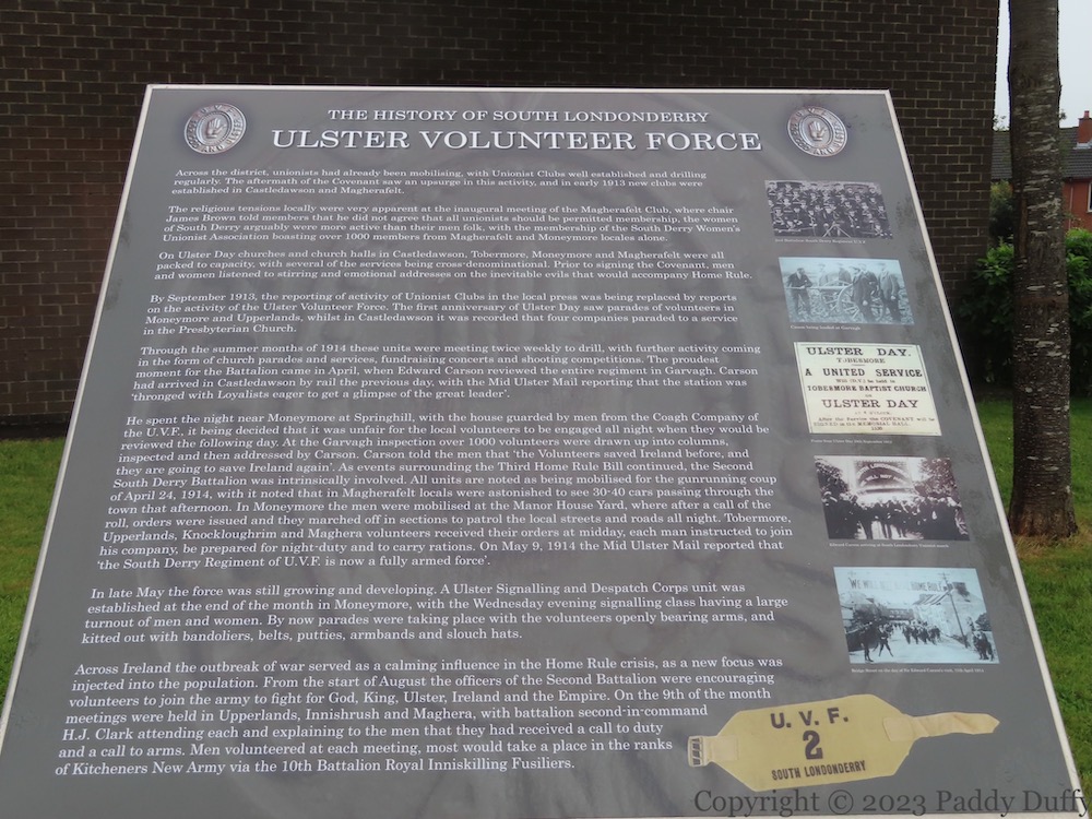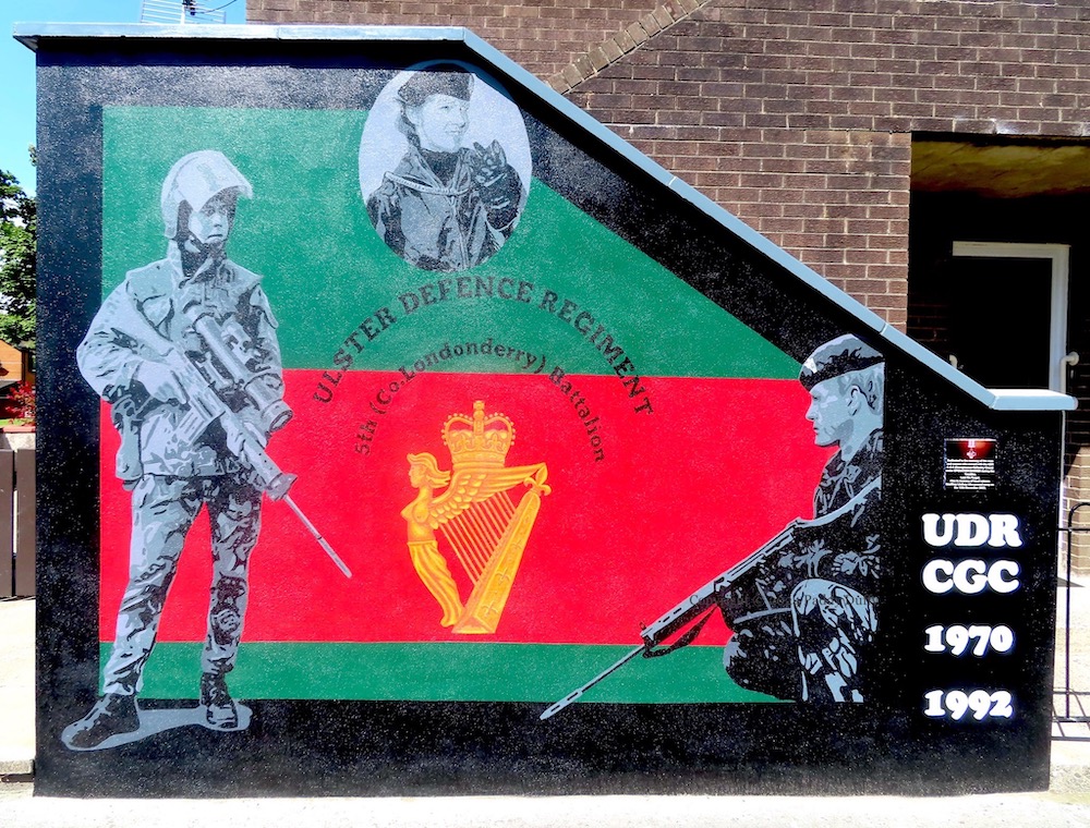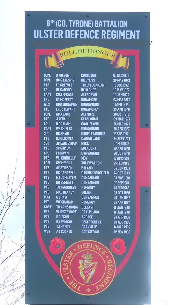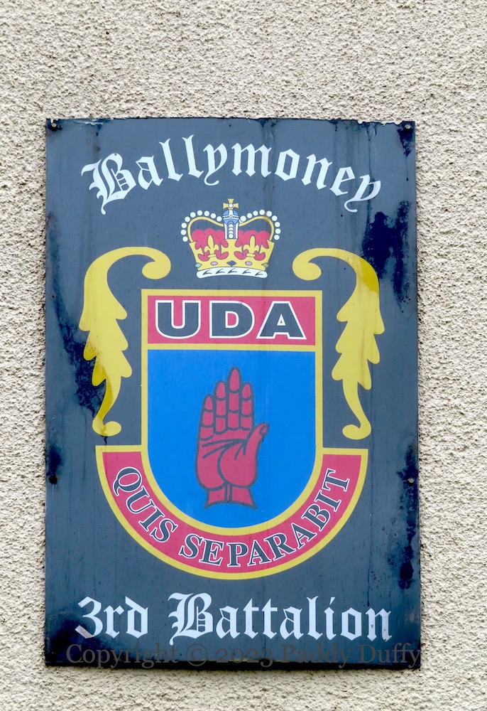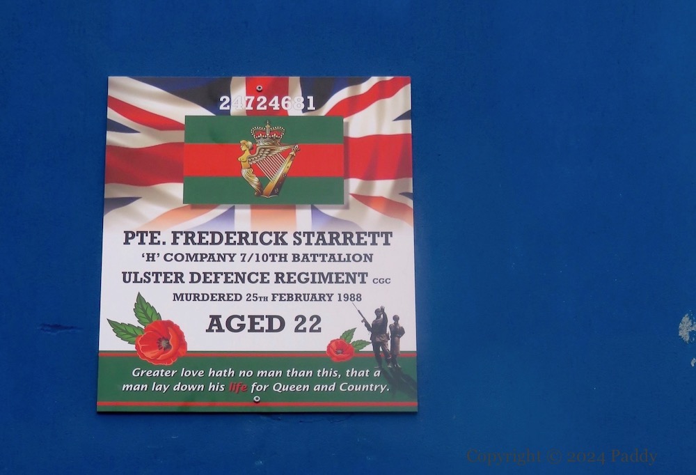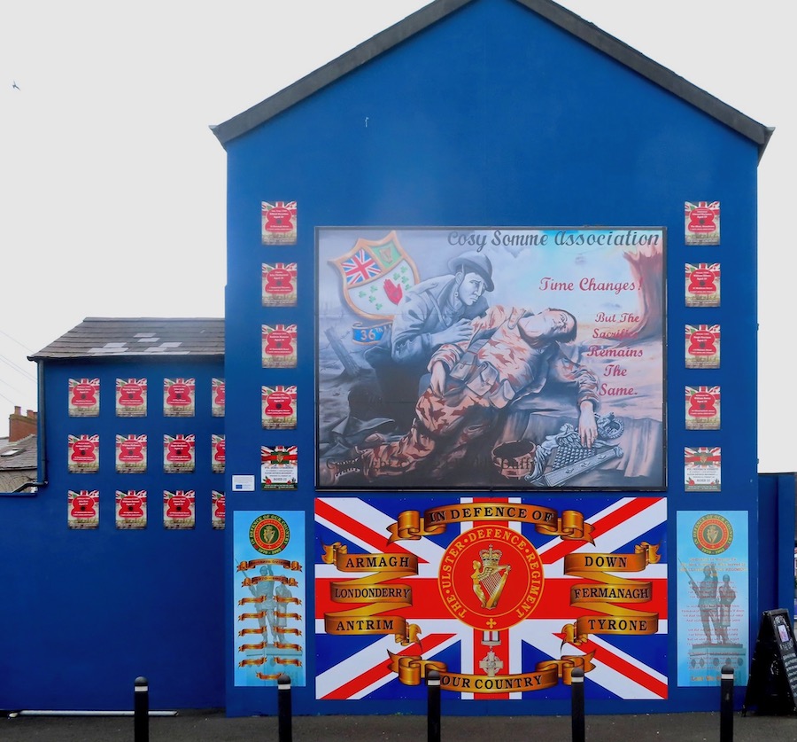 Here is a gallery of images from the wall behind the Shore Road ‘World Wars’ memorial (see Remembrance Sunday) which has a few new additions and re-ordered boards for this year’s commemorations. The main additions are the “Lest we forget” stencil shown above, and a large number of white crosses in the grass and along the fence bearing the emblem of the UDR. The UDR board has been moved from the slanted wall at the far left to what is now the central position on the wall.