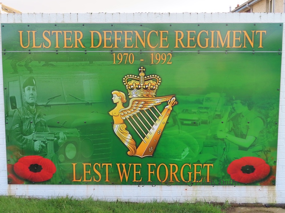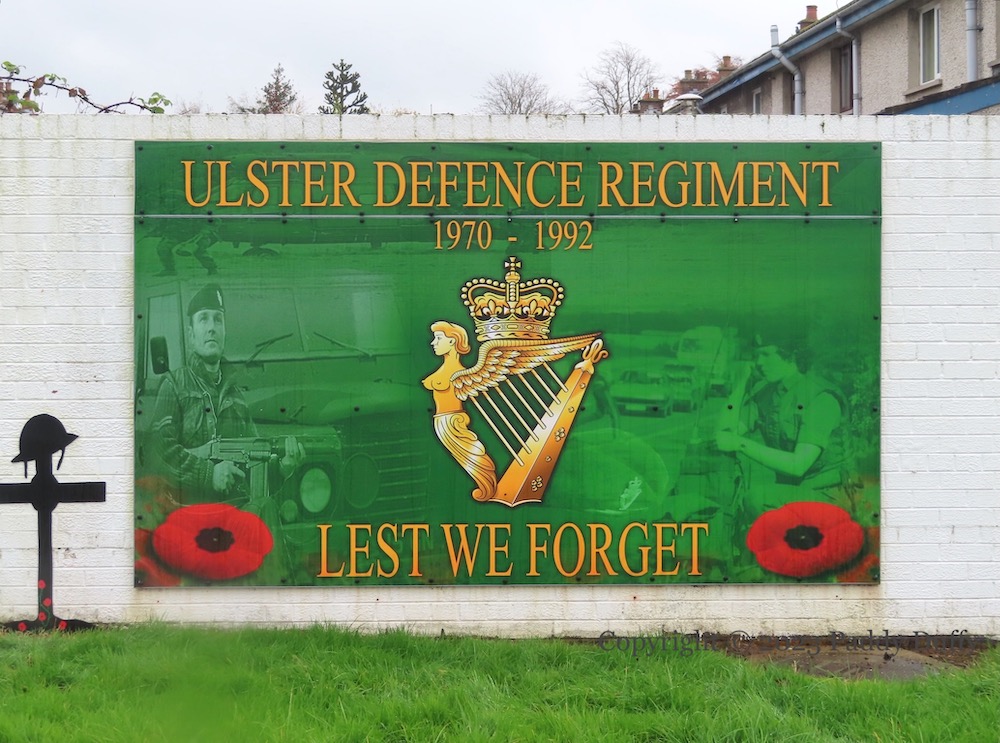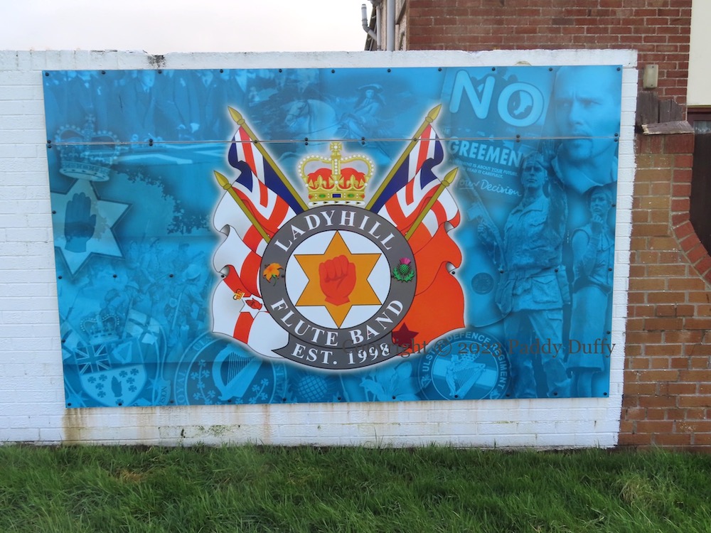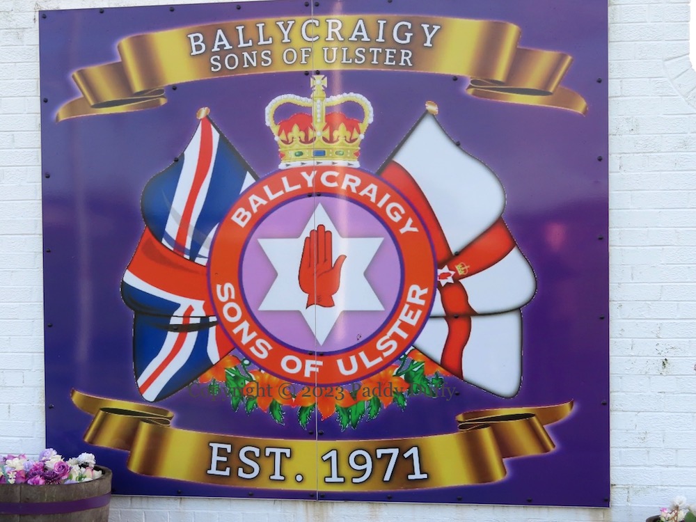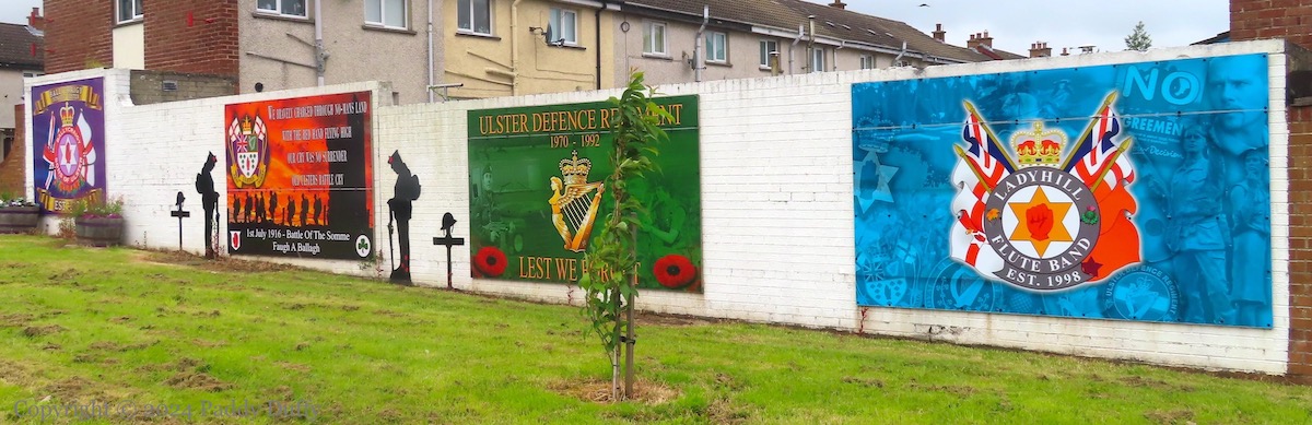 The military boards are flanked by boards for two local flute bands: “Ballycraigy Sons Of Ulster est. 1971” (tw) and “Ladyhill flute band est. 1998” (Fb).