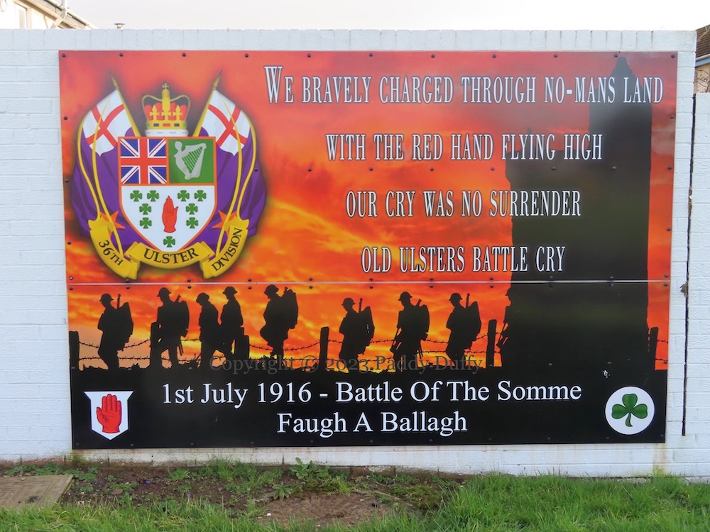 “‘We bravely charged through no-man’s land/With the red hand flying high/Our cry was ‘No surrender’/Old Ulster’s battle cry.’ 1st July 1916 – Battle Of The Somme. Faugh a ballagh.”