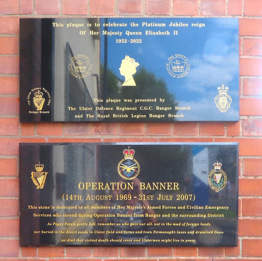 “This plaque is to celebrate the platinum jubilee reign of Her Majesty Queen Elizabeth II 1952-2022. This plaque was presented by the Ulster Defence Regiment CGC Bangor Branch and the Royal British Legion Bangor Branch.”
