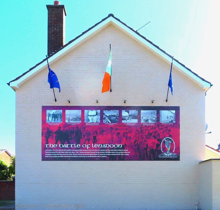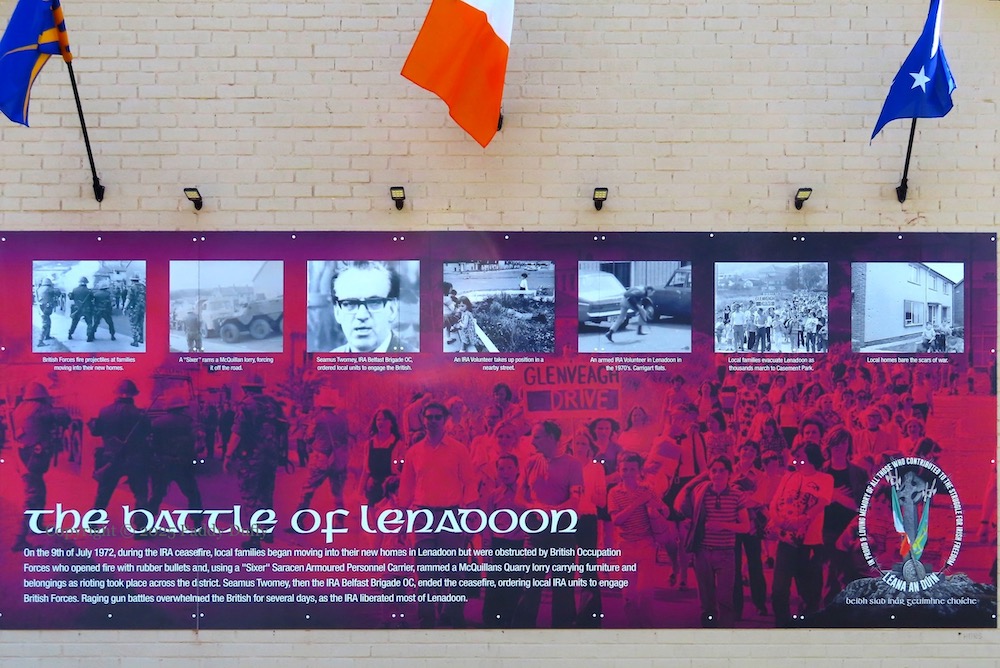 “On the 9th of July 1972, during the IRA ceasefire, local families began moving into their new homes in Lenadoon but were obstructed by British Occupation Forces who opened fire with rubber bullets and, using a “Sixer” Saracen Armoured Personnel Carrier, rammed a McQuillan’s Quarry lorry carrying furniture and belongings as rioting took place across the district. Seamus Twomey, then the IRA Belfast Brigade OC, ended the ceasefire, ordering local IRA units to engage British Forces. Raging gun battles overwhelmed the British for several days, as the IRA liberated most of Lenadoon.”