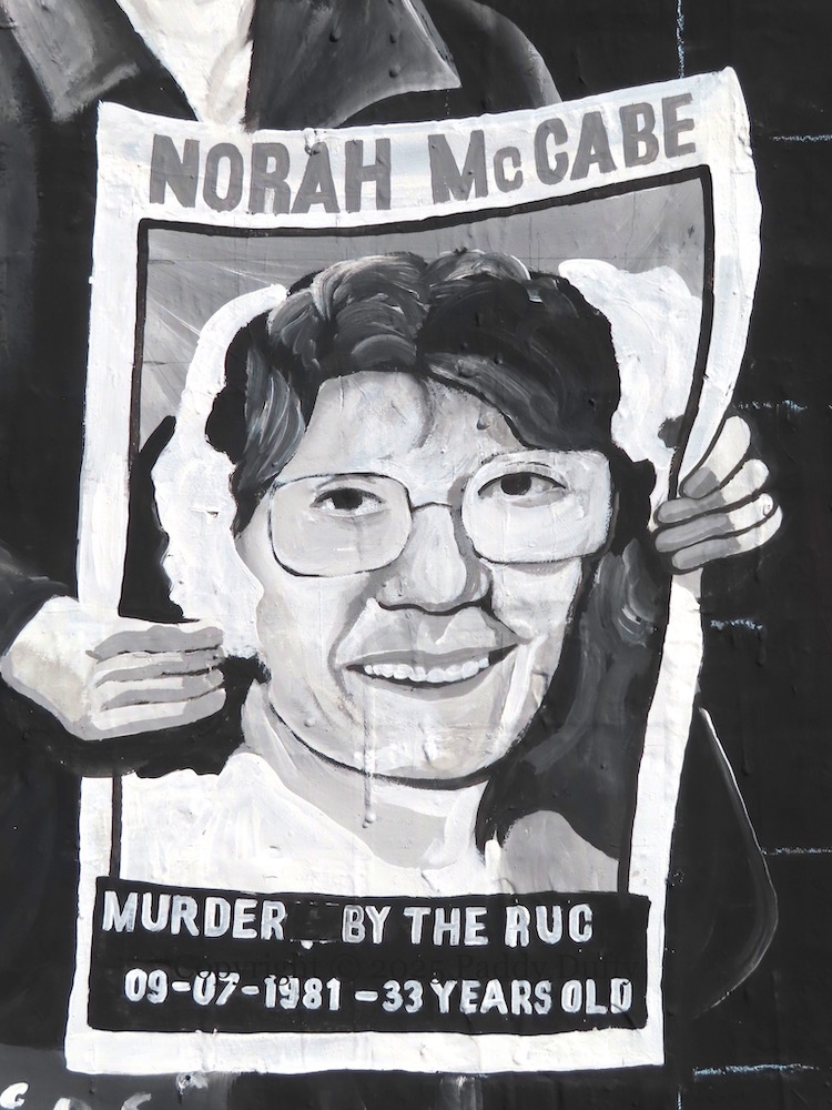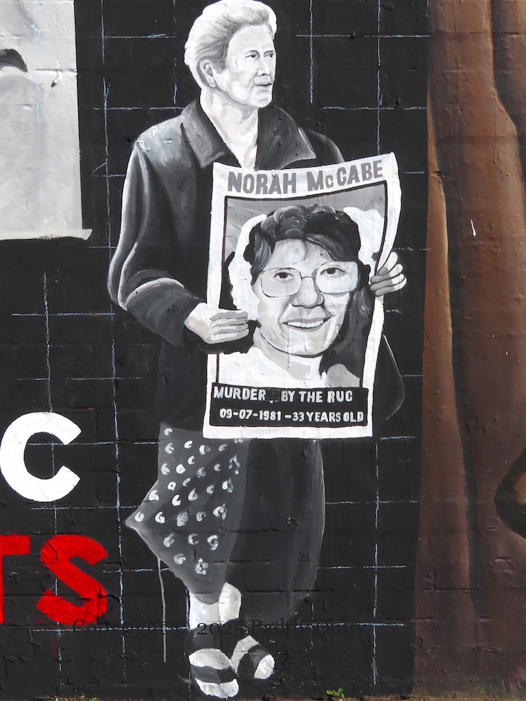 Jim McCabe, “life-long campaigner for truth and justice” after his wife Norah was killed by a plastic bullet in 1981, returns to the “International Wall” (Visual History) on Divis Street. The original mural – from a few months after his death in January 2023 – was replaced by A Window To A Free Country, one of the Palestinian-inspired murals. This new version replaces The Land Is Ours.