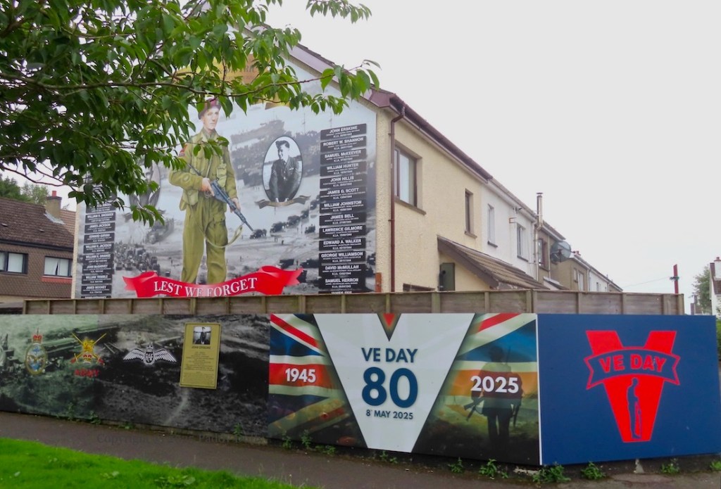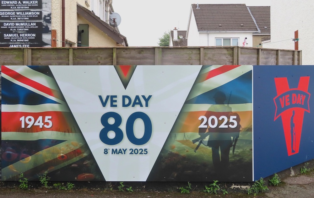 The memorial wall in Erskine Park, Ballyclare, marked the 80th anniversary of VE Day – May 8th, 2025 – with a pair of printed boards wrapping around the corner of the low wall.