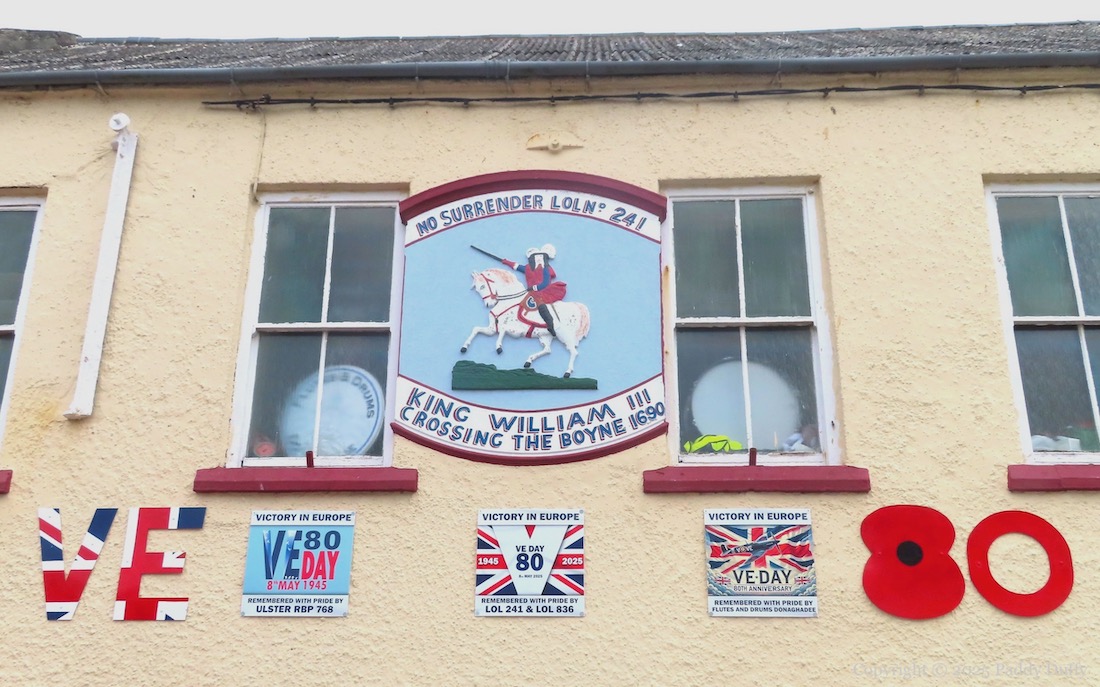 William’s victory is joined here by a number of small boards commemorating the 80th anniversary of Victory In Europe, on May 8th, 1945, “remembered with pride” by Orange lodges 241 and 836 (Brother Henry Ferguson Memorial), Royal Black Preceptory 768 (Ulster), and Flutes And Drums Donaghadee (Fb).