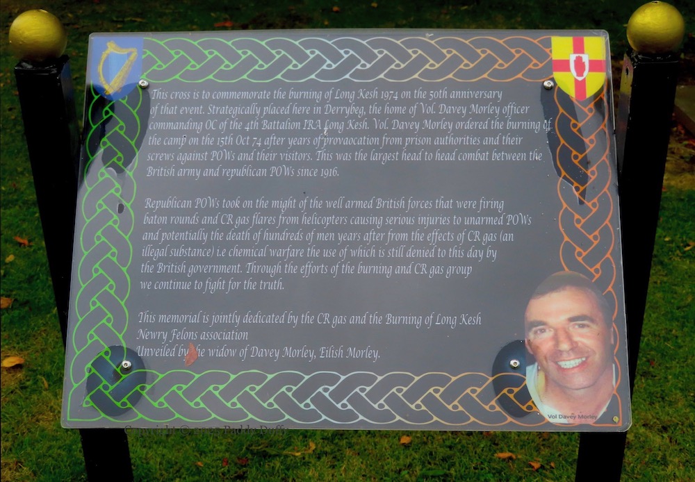 “This cross is to commemorate the burning of Long Kesh 1974 on the 50th anniversary of that event. Strategically placed here in Derrybeg, the home of Vol. Davey Morley officer commanding (OC) of the 4th battalion IRA Long Kesh. Vol. Davey Morley ordered the burning of the camp on the 15th Oct 74 after years of provaocation [sic] from prison authorities and their screws against POWs and their visitors. This was the largest head-to-head combat between the British Army and republican POWs since 1916. Republican POWs took on the might of the well-armed British forces that were firing baton rounds and CR gas flares from helicopters causing serious injuries to unarmed POWs and potentially the death of hundreds of men years after from the effects of CR gas (an illegal substance) i.e. chemical warfare the use of which is still denied to this day by the British government. Through the efforts of the burning and CR gas group we continue to fight for the truth. This memorial is jointly dedicated by the CR gas and the Burning of Long Kesh Newry Felons association. Unveiled by the widow of Davey Morley, Eilish Morley.”