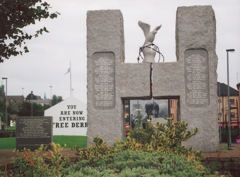 Here is a gallery of the murals and plaques in Clós Ard An Lao/Ardilea Close in the Machaıre Botháın/Marrowbone area of north Belfast. A full repertoire of republican events is commemorated – the United Irishmen, Great Hunger, the Rising, the Troubles, the (modern) hunger strikes. What is most striking is the significant presence of religious icons, such as the Sacred Heart in the glass cases in front of the two main murals (above and last below).