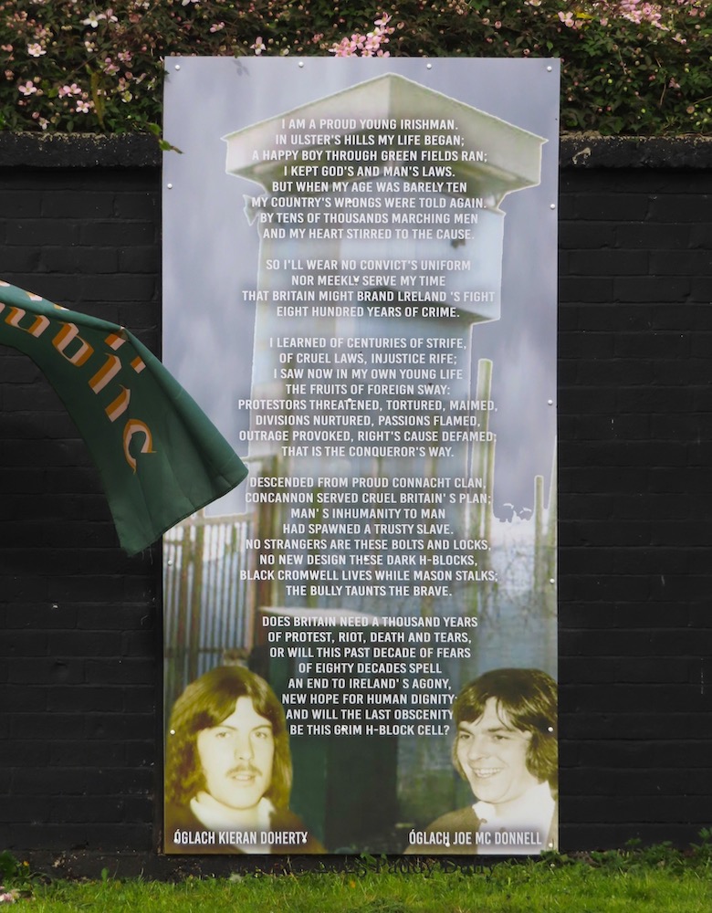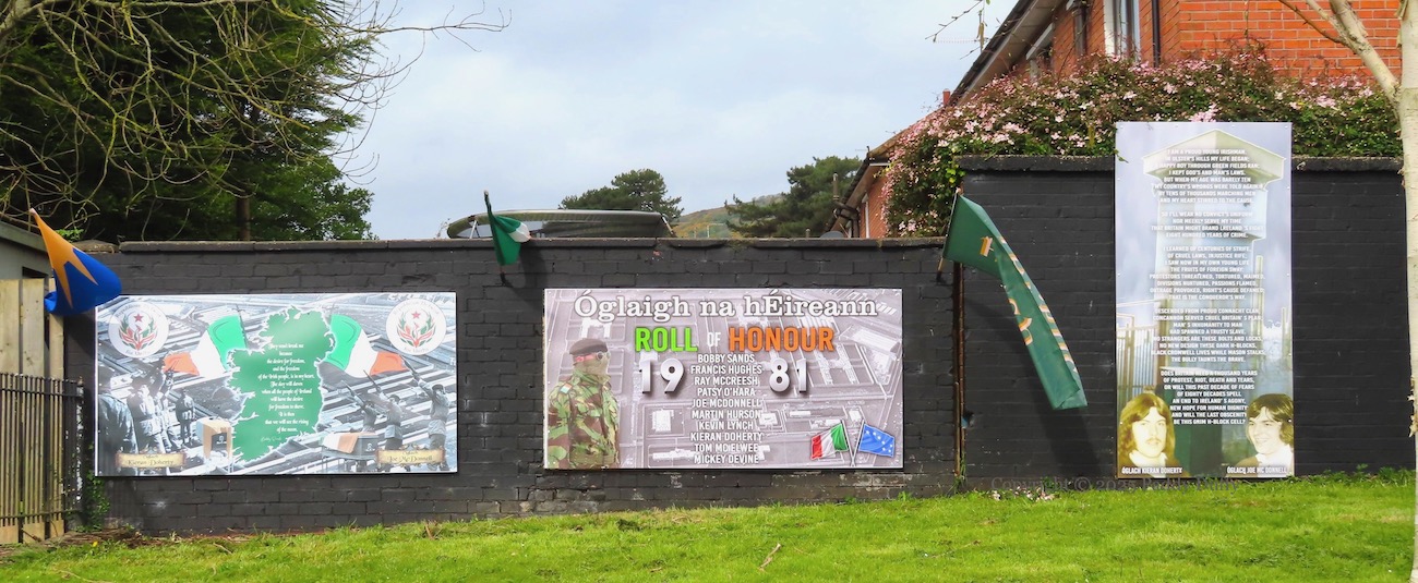 The signage seen here is in the New Lodge in north Belfast. On the left are the names of the ten deceased 1981 hunger-strikers, on the right, armed and masked volunteers pose against a background of a vintage picture of the flats (from Getty Images – BBC).