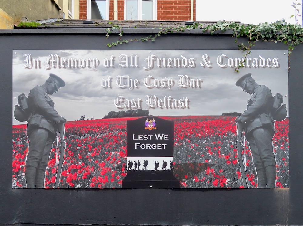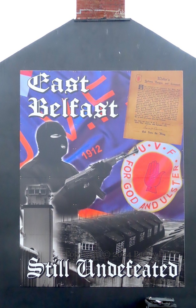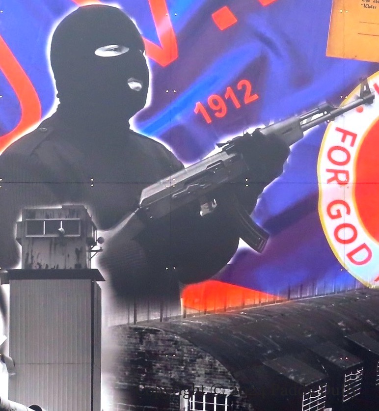 The UVF mural in Carlingford Street, east Belfast, that the one shown here replaces was controversial at the time (2013) because of its proposed inclusion of two hooded gunmen in fatigues firing into the air. In response to the concerns expressed, the final version put both figures in WWI uniforms and had only one firing into the air – the other gazed downward in prayer – and the modern UVF was referenced only in the forms of the towers and cages of Long Kesh and of a roll of honour. (See Years Of Sacrifice for both the draft and final murals.)