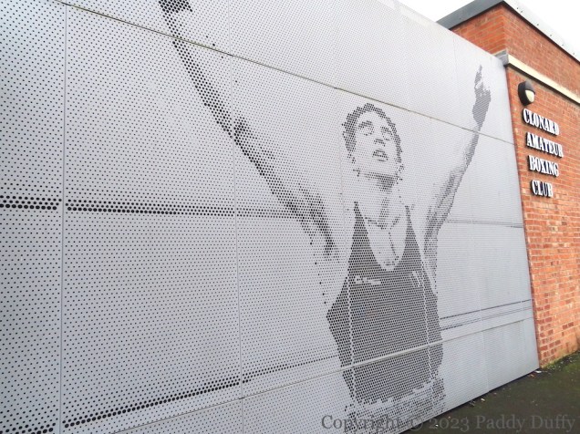 Michael Conlan is portrayed on perforated metal (by Graepels Perforators – Construction Ireland) on the refurbished electrical station that is now the new home of Clonard Amateur Boxing Club (Fb). Conlan boxed at the club for about a decade before turning pro (Belfast Live).