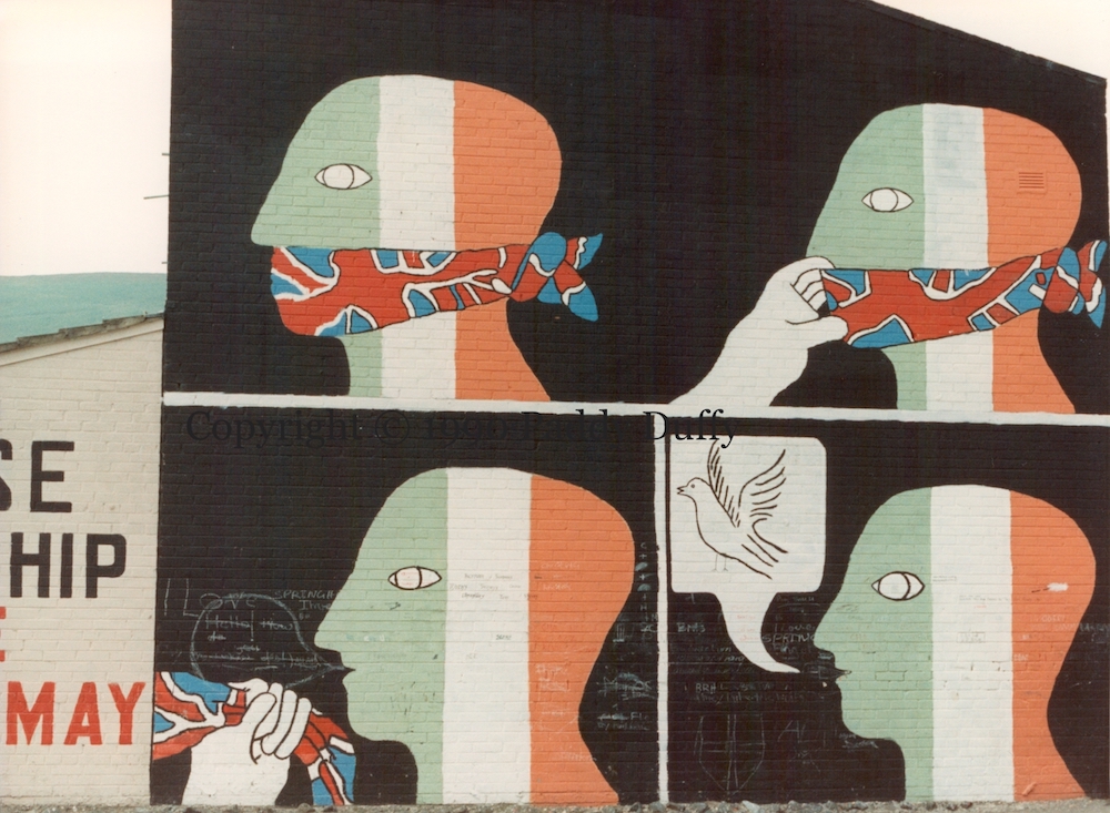 A Cormac cartoon protesting British censorship of Sınn Féın is rendered as a mural by Mo Chara Kelly. The broadcasting Ban was put in place in 1988, disallowing Sınn Féın representatives from speaking in their own voice on television and radio. But if the gag of British censorship were removed, the talk is of peace (in the form of a dove) – suggesting that there is some for negotiation on the violent removal of British forces and administration.