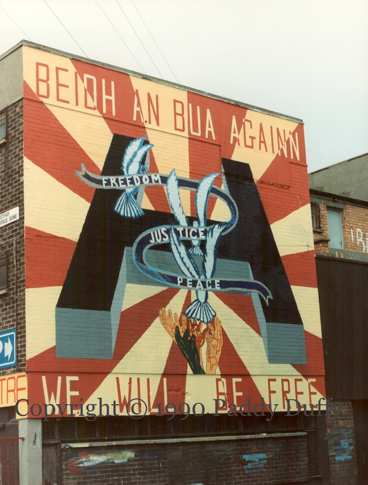 “Beıdh an bua agaınn” [victory will be ours] is a slogan that Mo Chara Kelly saw inside a cell in the H-Blocks. A circle of four hands – perhaps intended to be in the colours of humankind – releases three doves: “freedom, justice, peace”. “We will be free.”