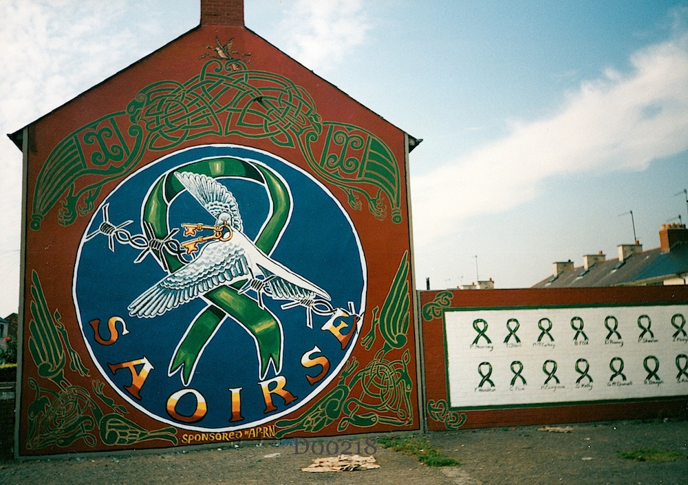 The central circle was repainted (again Redmond) for the 1995 “green ribbon” campaign: the dove holds the keys that will set free the republican prisoners, symbolised by the barbed wire and the lark in the apex. There was also a side-wall, showing two rows of green ribbons, each with the name of a POW (see immediately below).