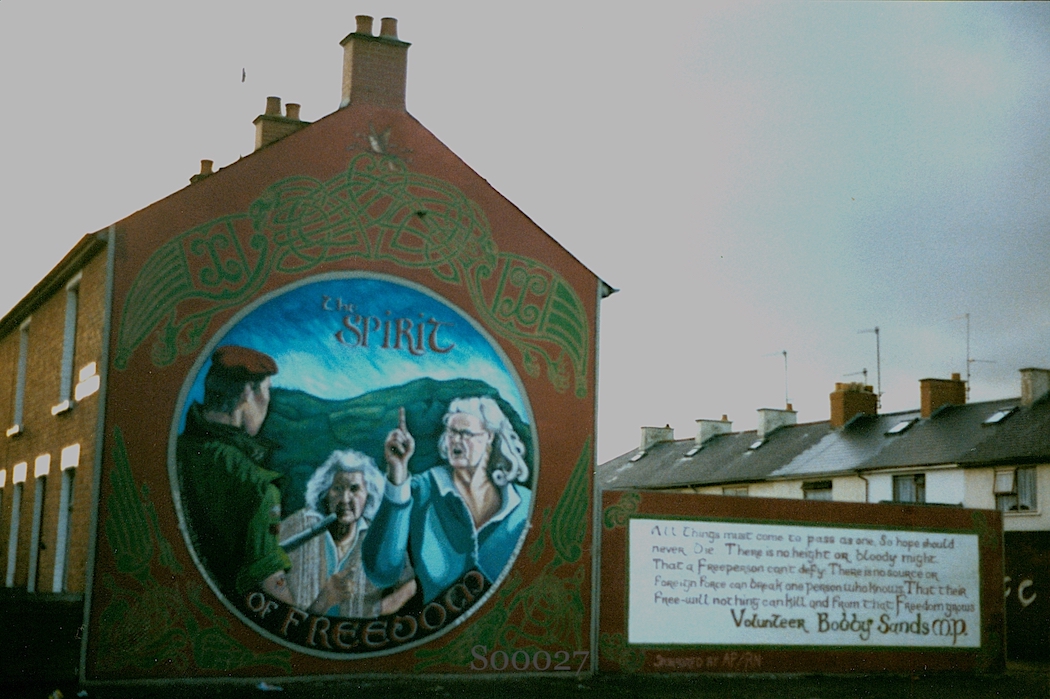 The frame of this mural in St James’s was originally painted by Andrea Redmond (Fb) in 1994 for a mural (included below) showing local pensioners remonstrating with a British Army soldier, under the title “The Spirit Of Freedom”, reproducing a photo that appeared in a French-language magazine (see below).