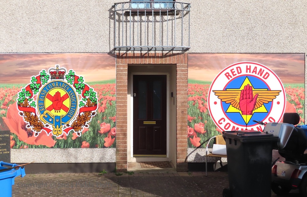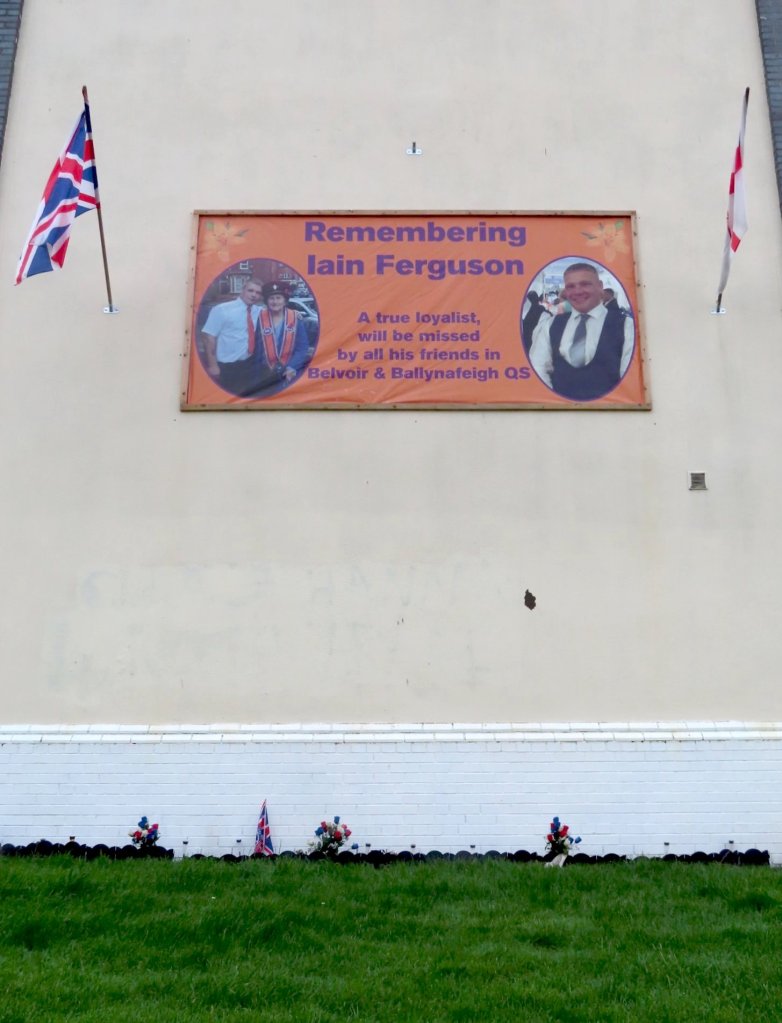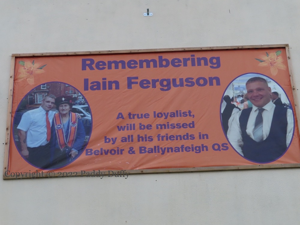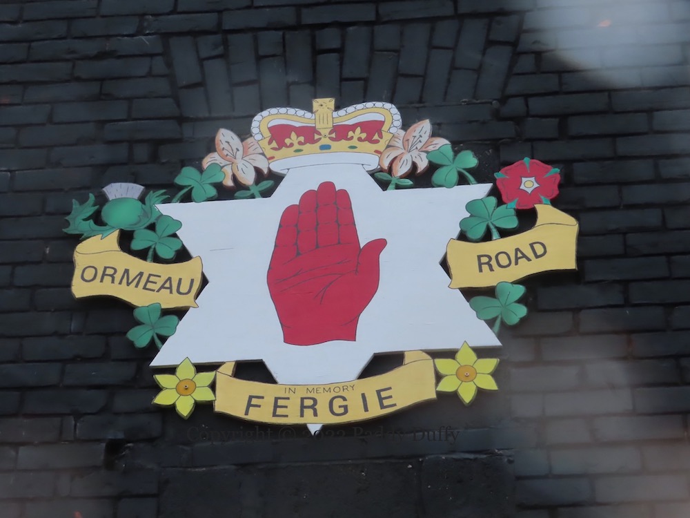 “Fergie” is perhaps Iain Ferguson, who died in 2021 (Belvoir & Ballynafeigh UPRG on Fb) and is remembered in a tarp on the side of the flats in Belvoir, shown below. (UPRG is affiliated with the UDA – hence the red hand and the six-pointed star in the plaque, alongside the flowers of the four nations – rose, shamrock, daffodil, thistle – and orange lily.)