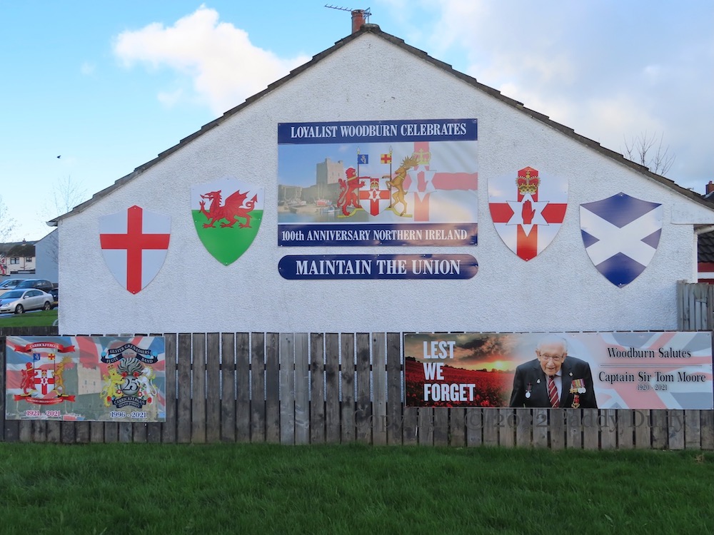 “Loyalist Woodburn celebrates 100th anniversary Northern Ireland”. Maintain the union of (left to right) England (St George’s Cross), Wales (The Red Dragon), Northern Ireland (Ulster Banner), Scotland (St Andrew’s Saltire). Along the fence we have the NI coat of arms and Captain Sir Tom Moore.