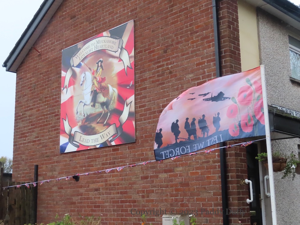 “Welcome to Muckamore, loyalist heartland – lead the way.” “In defence of our heritage and culture.”