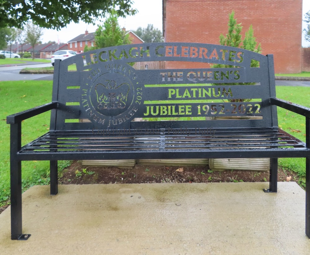 The tribute to the new UK monarch King Charles III at the northeastern corner of Tiger’s Bay has been completed, with Ulster Banner and Union Flag on either side of a circular board showing a crown with the flowers of the “four nations” – thistle, shamrock, daffodil, and rose – both inside (in blue) and out (in red).