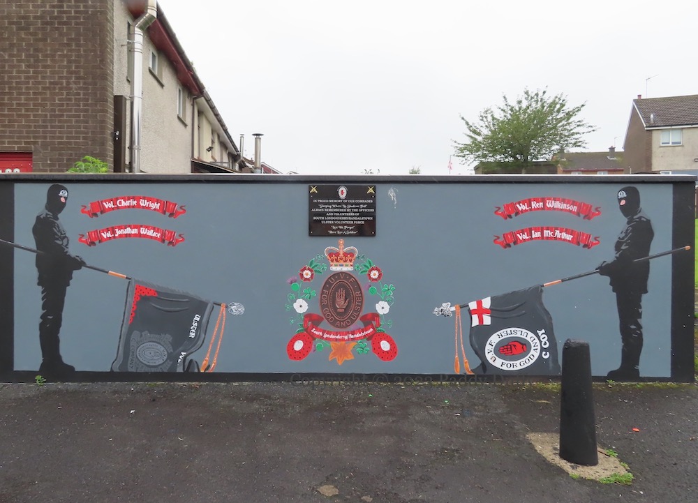 “Always remembered by the officers and volunteers of South Londonderry/Randalstown Ulster Volunteer Force.” This memorial mural and plaque in Magherafelt names Charlie Wright, Jonathan Wallace, Ken Wilkinson, and Ian McArthur.
