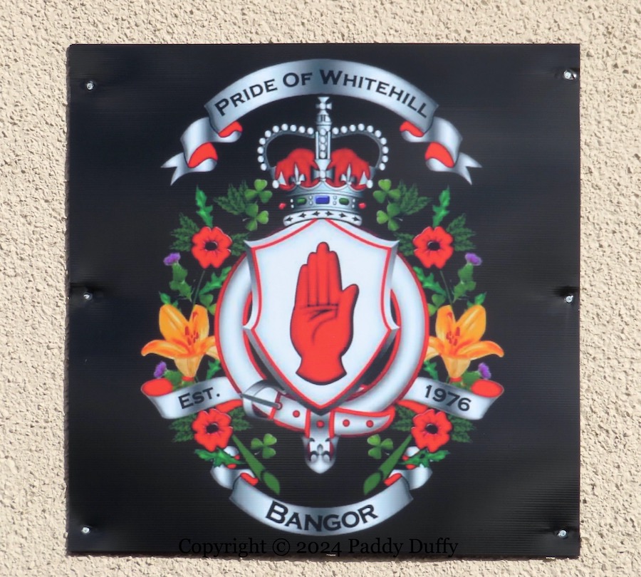 Here are two new small boards on the fence where Hawthorn Avenue and Sandes Court meet between Woodburn and Sunnylands. Above, “Remembering our fallen everyday [sic]” with images of soldiers from the World Wars and UVF emblems in the corners. Below, an Ulster Grenadiers flute band (Fb) board, similar to the large board mounted last year (2024) in St Bride’s Street – see Never Forget, Always Remember.