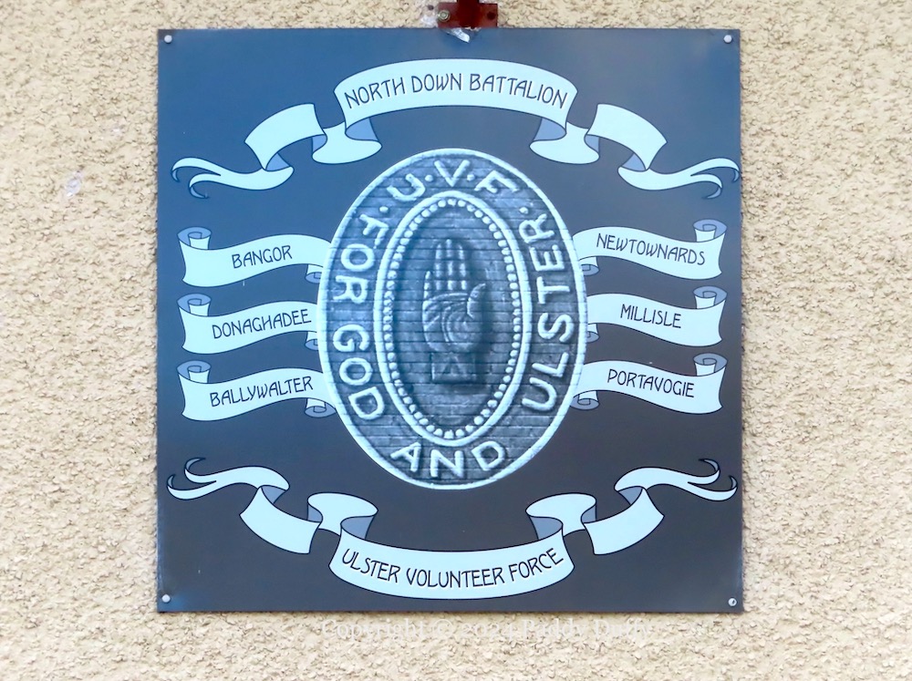 Here is a gallery of small boards on flower boxes in “the Village Green community park of remembrance”: “The Protestant faith we will maintain. Your culture needs you. Join your local band, Orange lodge, Apprentice Boys, Royal Black historical group”, with Kitchener pointing at the viewer; “Deserted – Well, I can stand alone!“; “Ulster Day, 28th September, 1912“; “No Home Rule. Let our flag run out straight in the wind. The old red shall be floated again. When the ranks that are thinned shall be thinned. When the names that are twenty are ten“; – Edward Carson and the formation of the Ulster Volunteers in 1913; – All nine counties of Ulster are “Hands up!” “against Home Rule”.