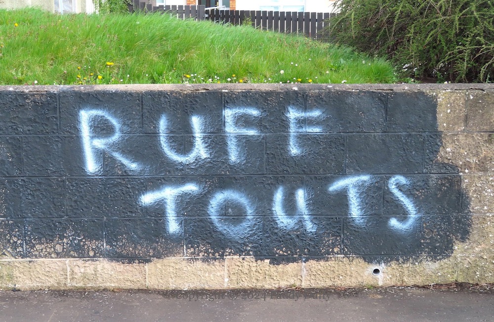 The area is a UVF stronghold but split between the North Down and East Belfast battalions – see Welcome To Bowtown and North Down UVF. The very bottom of the estate is UDA – “RUFF touts” is on the border-line, Skipperstone Road.