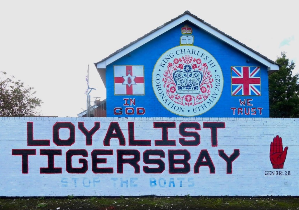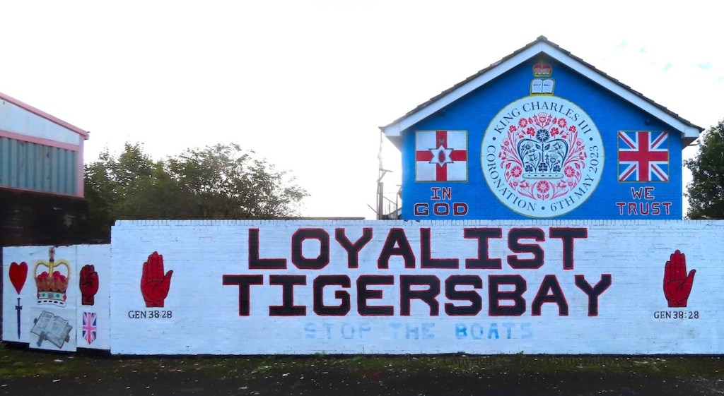 For ‘Loyalist Tiger’s Bay’ on the front wall, see the Stop The Boats; for the Orange Order symbols on the side wall (in the final image) – including the crown and Bible in the apex of the main wall – see Your Kingdom Will Endure Forever.