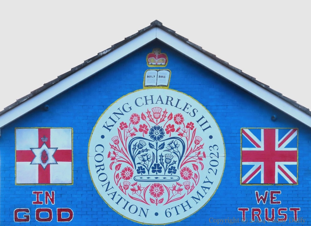 The two passages cited here have been cited before on the side wall at the junction of the Limestone Road and N Queen St, with images of Orange symbols and Union Flags, in order to promise that Your Kingdom Will Endure Forever. That theme has now been invoked in upper Tiger’s Bay, to celebrate the latest king (Charles III) of the everlasting kingdom demarcated by the shields of the “four nations” in the corners of the main gable, Northern Ireland included.