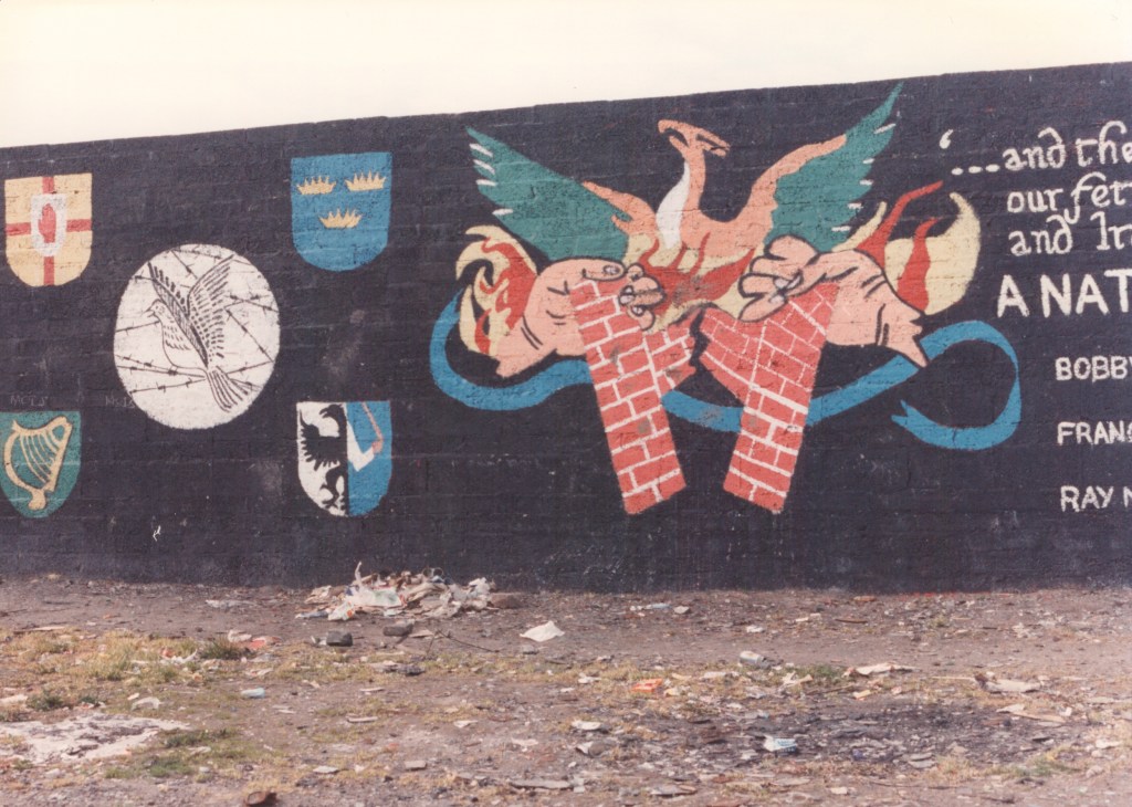 There was originally a memorial to Bobby Sands and painted crests of the four provinces below this phoenix emerging from the flames – see M01001 from 1991. It was originally painted by Mo Chara Kelly in 1987.