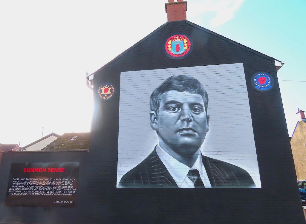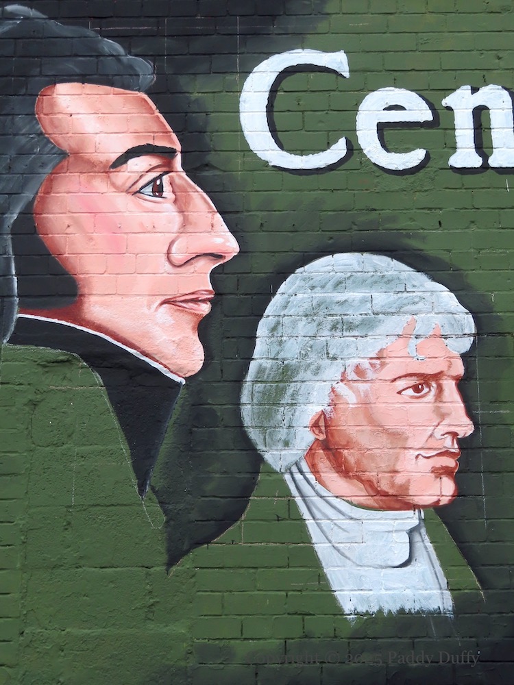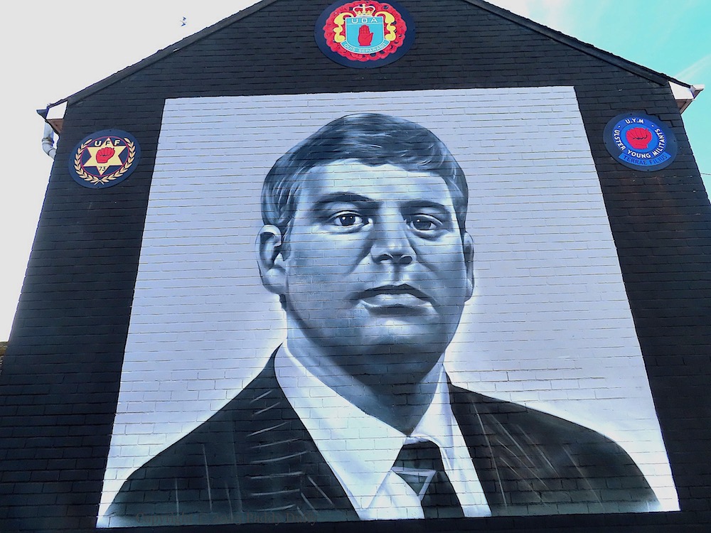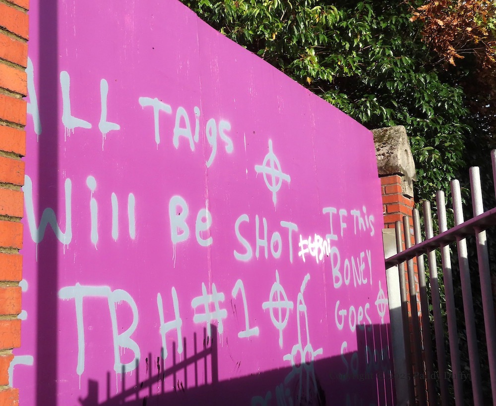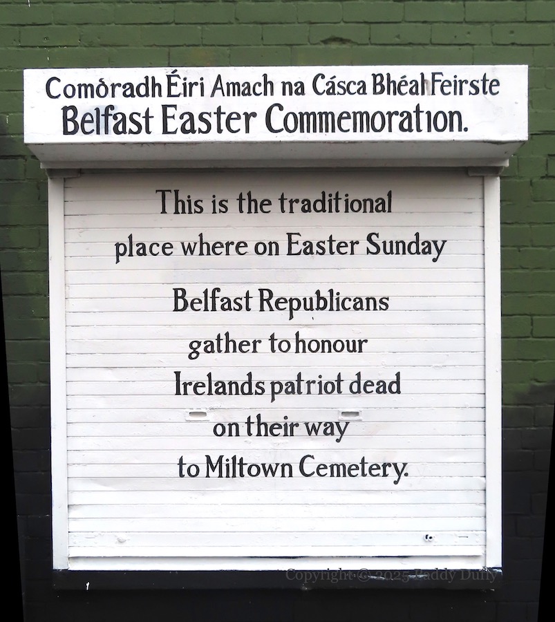 Michael Gaughan and Frank Stagg are presented along with the ten deceased 1981 hunger strikers on the cross-beam of a large wooden “H” at the top of Turf Lodge.