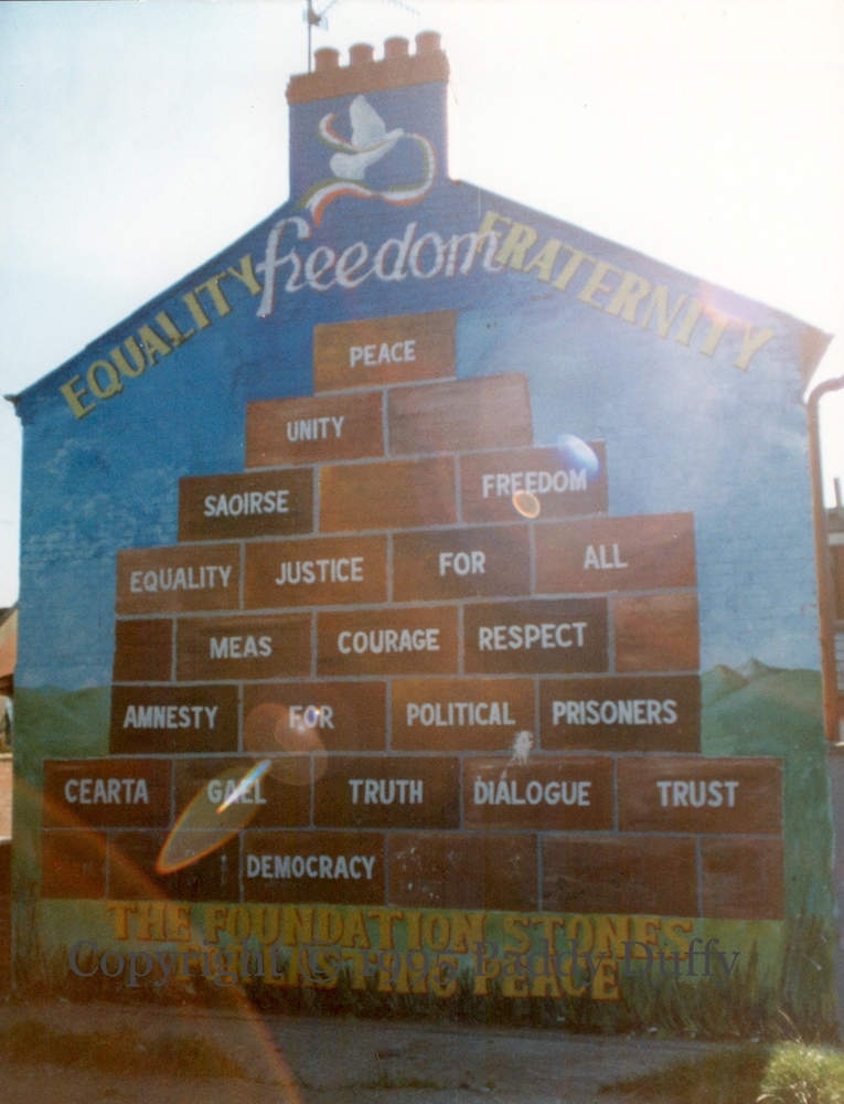 There is also a plaque to local man Kieran Doherty, reading “Vol. Kieran Doherty T.D. Óglaıgh Na hÉıreann. Age 25. Commenced his hunger strike on May 22 and tragically died on Sunday afternoon 2 Aug 1981. Kieran was elected T.D. by the people of Cavan And Monaghan in their support of the prisoners’ campaign for political status.” This plaque would be retained when this wall became a memorial mural to Doherty in 2001.