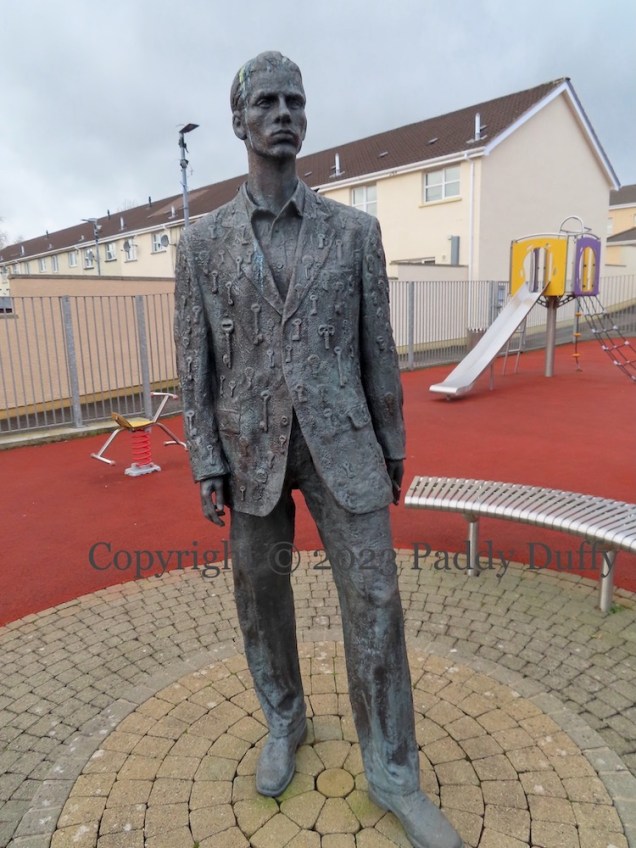 “This Sculpture is about unlocking freedom, a community that does not know outward social freedom can still know inward personal freedom. The key to freedom is formed within the heart, each individual has an unseen key that can help a community unlock the knowledge of itself. The Apprentice Angel is a bringer of freedom, he is patterned with keys collected within The Fountain Estate by young people from The Cathedral Youth Club. The Angel holds a large recast key from the Siege of Derry 1689, a key in the hand of an Apprentice that helped turn history, the Past is always present but the Future is key to us all, we alone have the power to unlock it and the right to experience it. Within a community it is young hearts that beat loudest, it is their future that we must help unlock with the keys of Freedom. This was a Cathedral Youth Club project funded by Arts Council Re-Imaging Communities. Sculptor – Ross Wilson. [2009]”