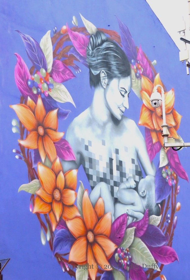 The art shown here was painted by Peaball (web) on an exterior wall of the Pram Centre (web) in Great James Street, Derry and launched on 2024-11-29. (The pixelation is part of the painting. See also the ‘period products’ mural in Belfast – About Bloody Time.)