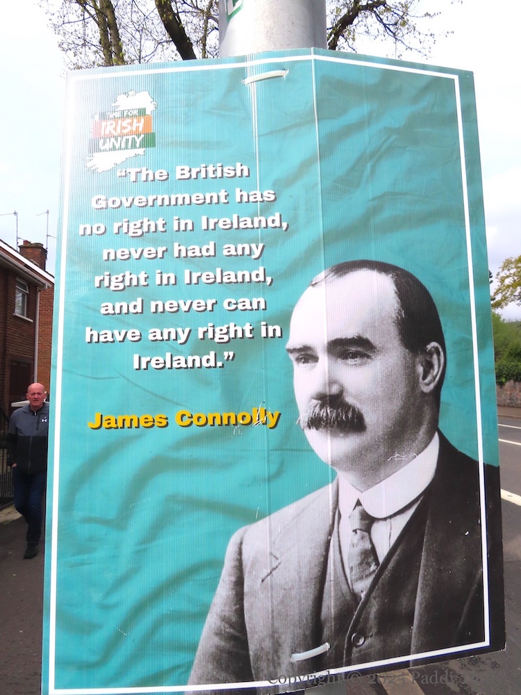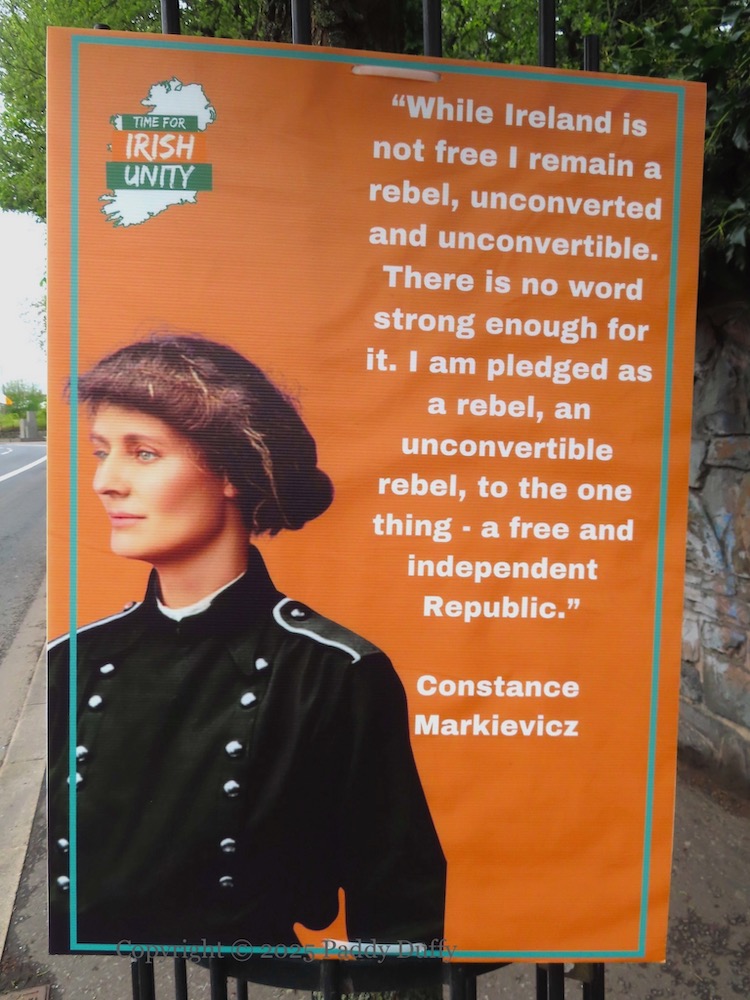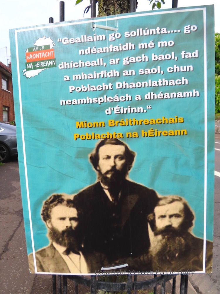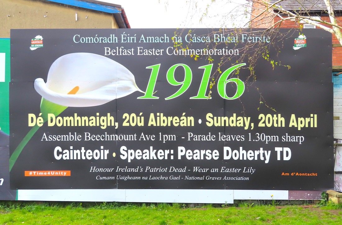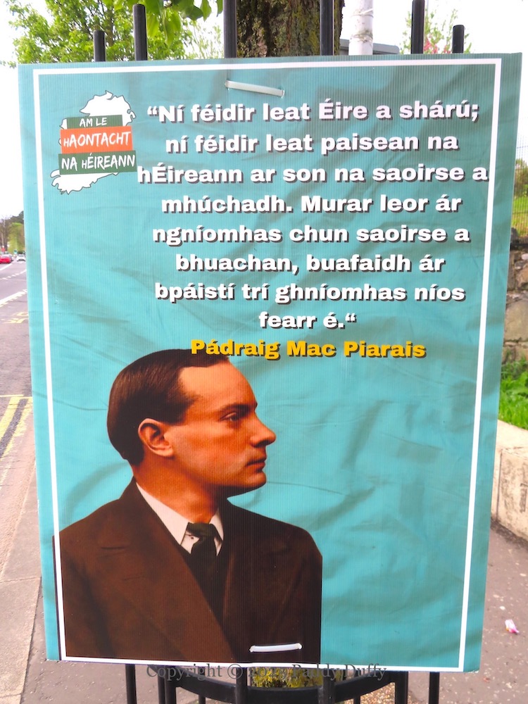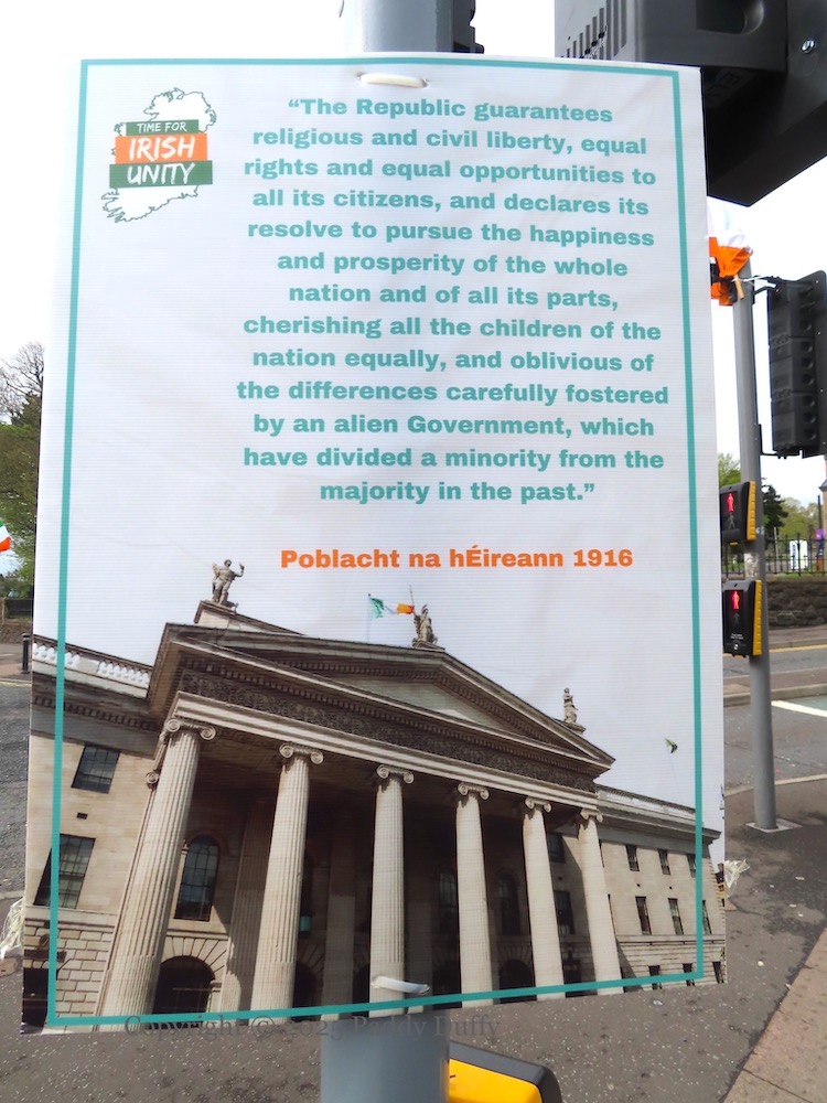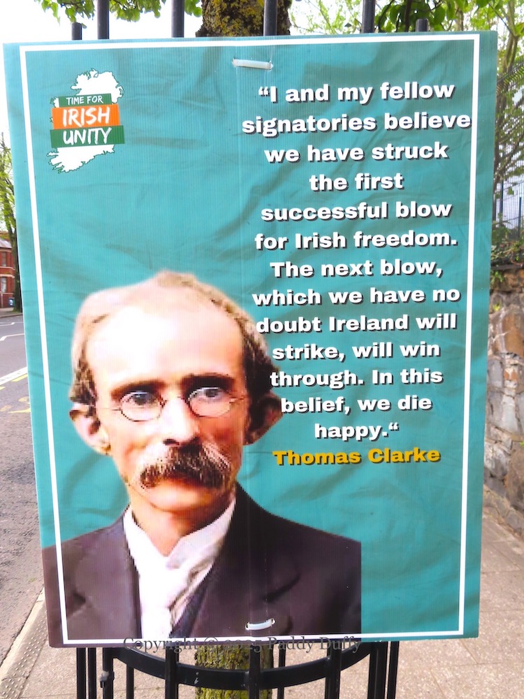 For Sunday’s parade (in Belfast) commemorating the Easter Rising of 1916, Sınn Féın lined the route with placards featuring quotations from republican heroes past and present: the first Dáıl, Wolfe Tone, Robert Emmet, James Fintan Lalor, Roger Casement, the Proclamation of 1916, William Allen, the Declaration Of Independence, James Larkin (as Gaeılge), Máıre Drumm, Rita O’Hare, Martin McGuinness, Mary Lou McDonald, Bobby Sands, O’Donovan Rossa, John O’Mahony, Seán Mac Dıarmada, James Connolly, Liam Lynch, Thomas Clarke, Pádraıg Mac Pıaraıs, Maıréad Farrell, the IRB, Michelle O’Neill, Gerry Adams, Constance Markievicz, Winifred Carney, Na Fíníní.