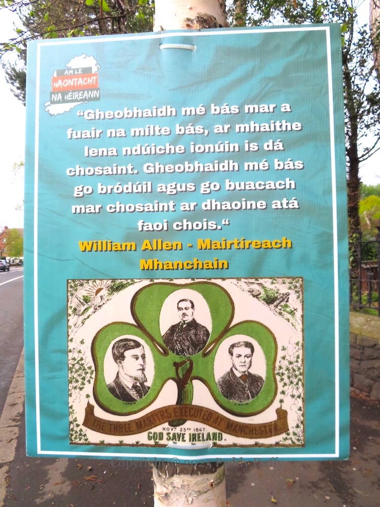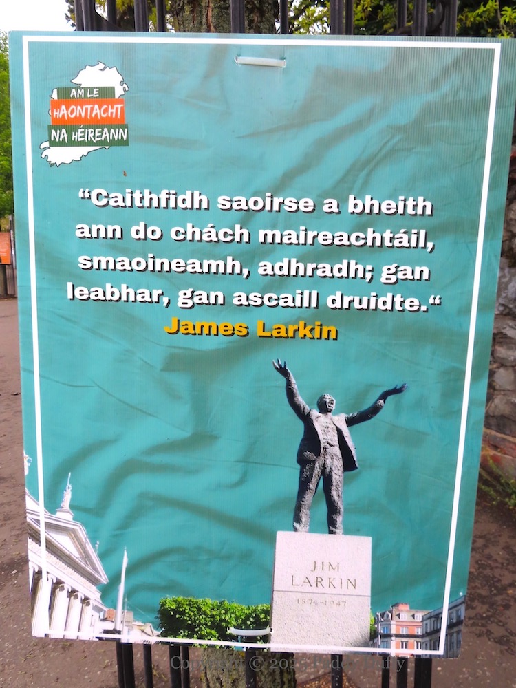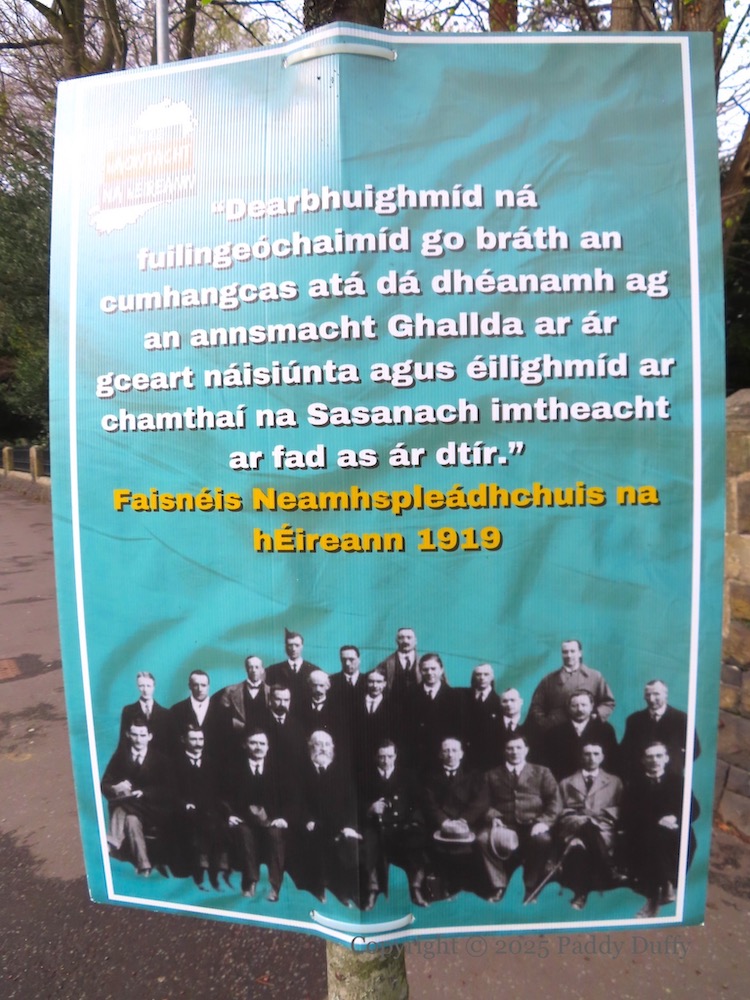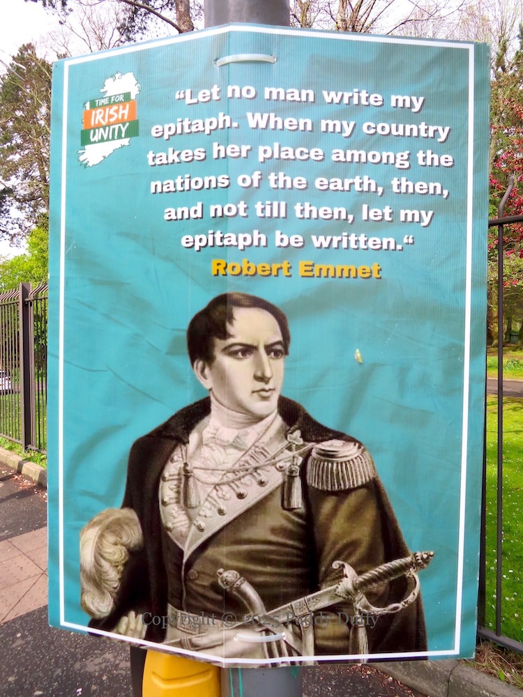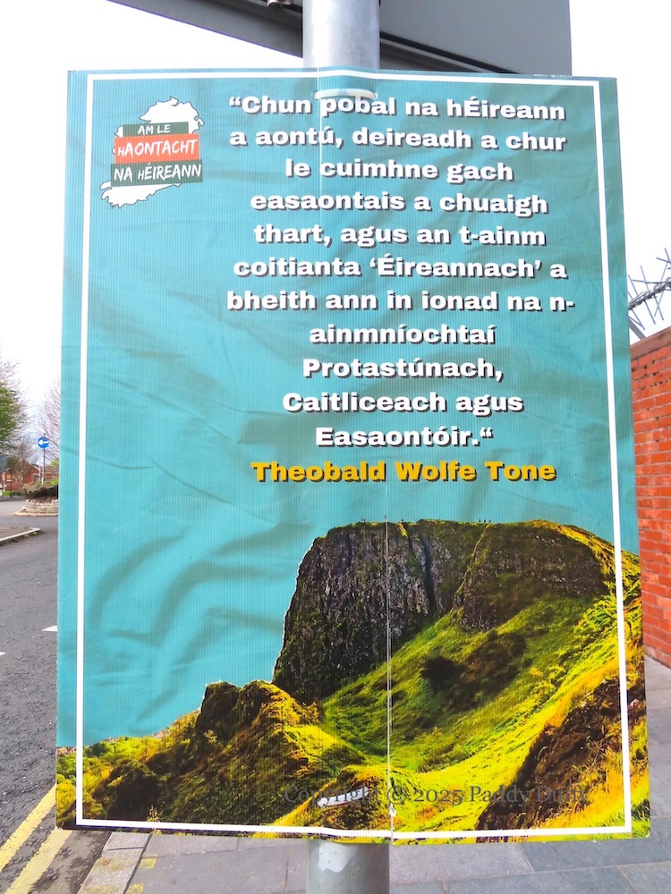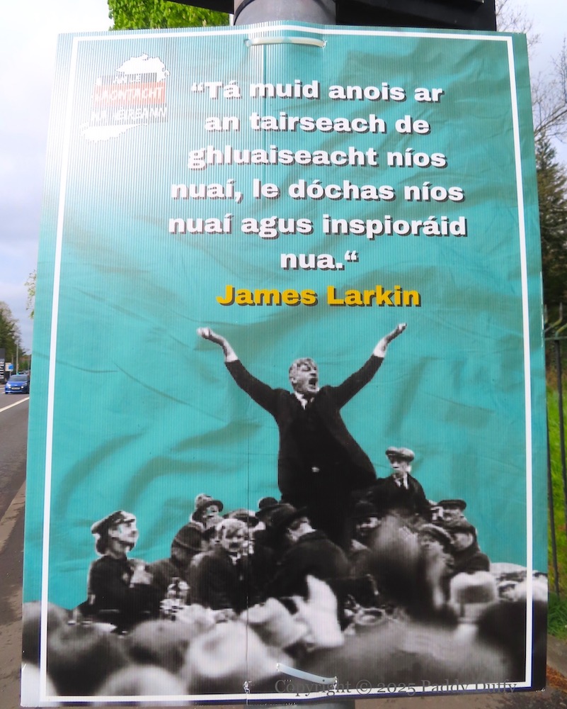 For Sunday’s parade (in Belfast) commemorating the Easter Rising of 1916, Sınn Féın lined the route with placards featuring quotations from republican heroes past and present: the first Dáıl, Wolfe Tone, Robert Emmet, James Fintan Lalor, Roger Casement, the Proclamation of 1916, William Allen, the Declaration Of Independence, James Larkin (as Gaeılge), Máıre Drumm, Rita O’Hare, Martin McGuinness, Mary Lou McDonald, Bobby Sands, O’Donovan Rossa, John O’Mahony, Seán Mac Dıarmada, James Connolly, Liam Lynch, Thomas Clarke, Pádraıg Mac Pıaraıs, Maıréad Farrell, the IRB, Michelle O’Neill, Gerry Adams, Constance Markievicz, Winifred Carney, Na Fíníní.