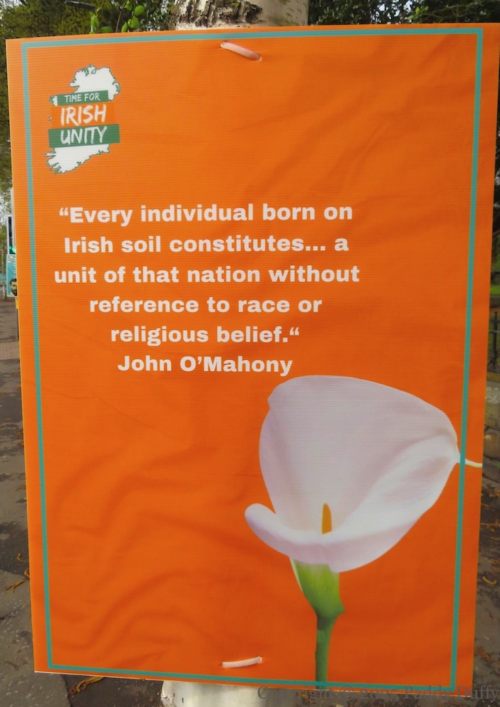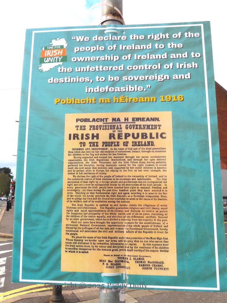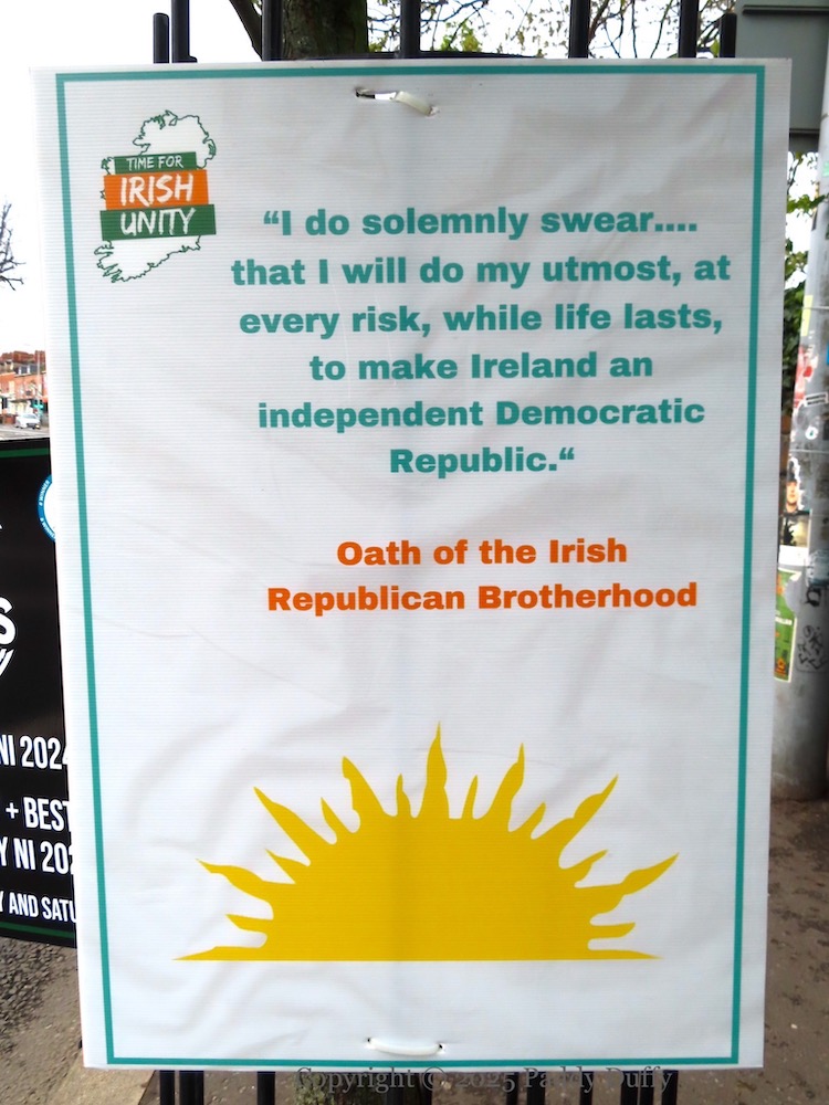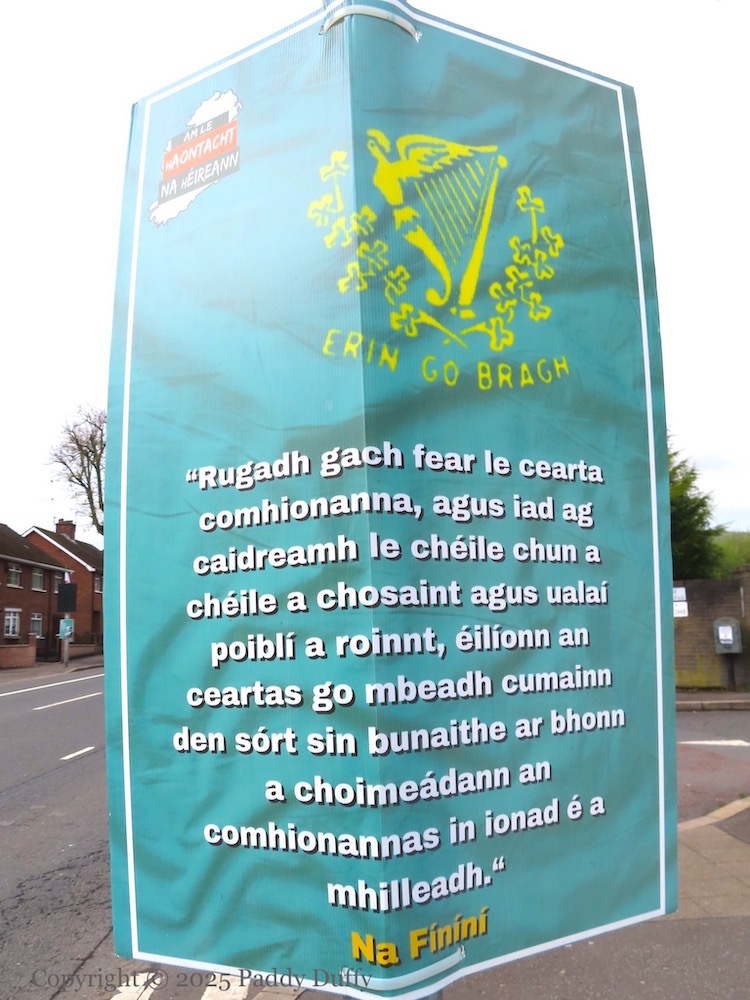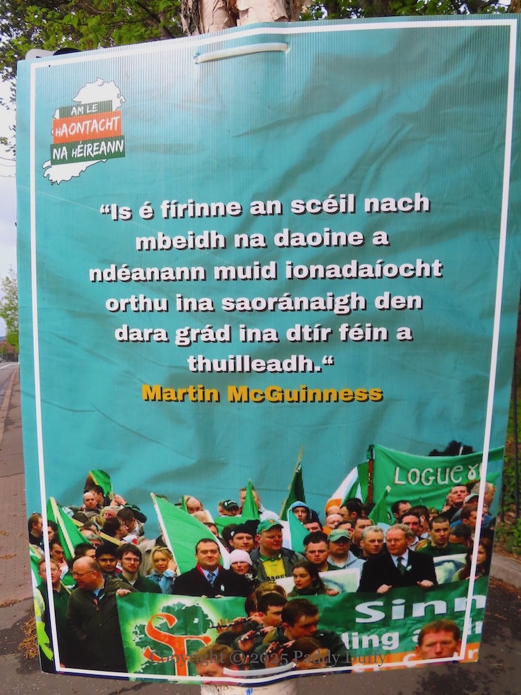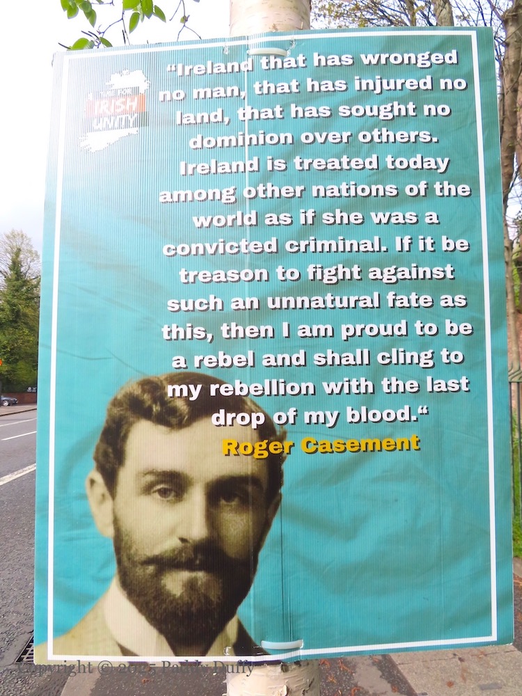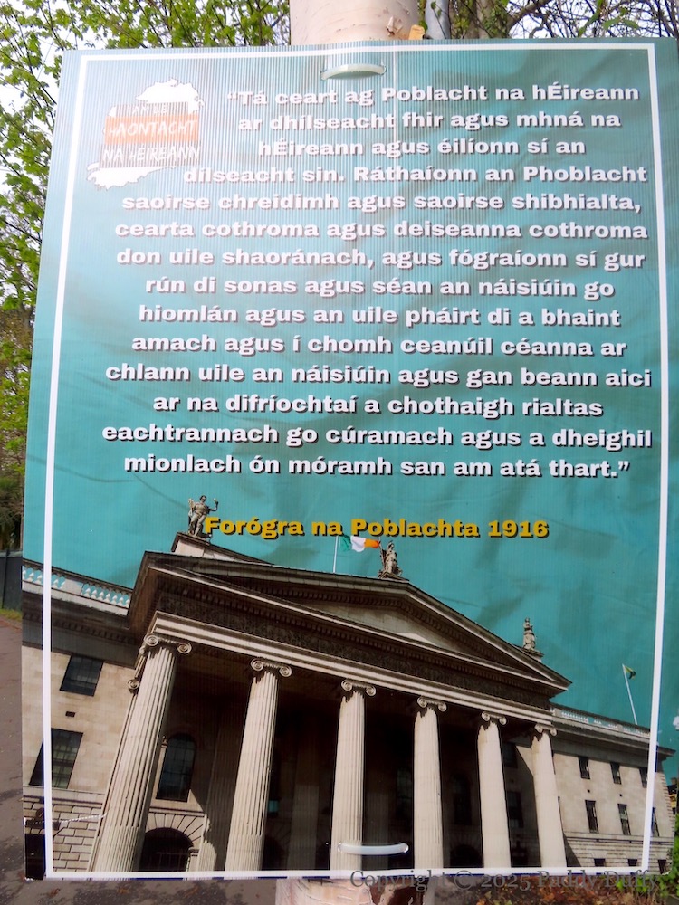 For Sunday’s parade (in Belfast) commemorating the Easter Rising of 1916, Sınn Féın lined the route with placards featuring quotations from republican heroes past and present: the first Dáıl, Wolfe Tone, Robert Emmet, James Fintan Lalor, Roger Casement, the Proclamation of 1916, William Allen, the Declaration Of Independence, James Larkin (as Gaeılge), Máıre Drumm, Rita O’Hare, Martin McGuinness, Mary Lou McDonald, Bobby Sands, O’Donovan Rossa, John O’Mahony, Seán Mac Dıarmada, James Connolly, Liam Lynch, Thomas Clarke, Pádraıg Mac Pıaraıs, Maıréad Farrell, the IRB, Michelle O’Neill, Gerry Adams, Constance Markievicz, Winifred Carney, Na Fíníní.
