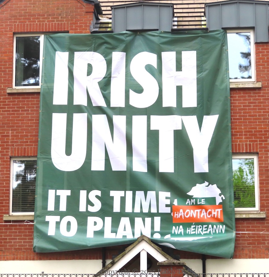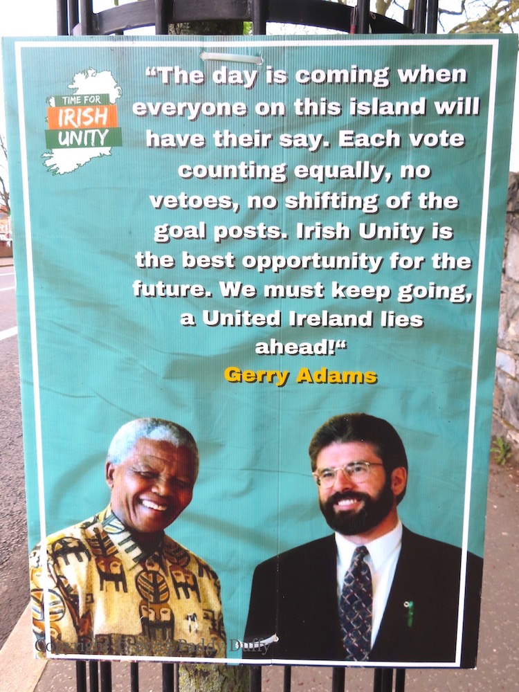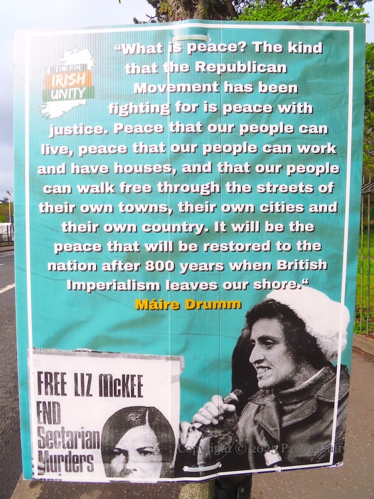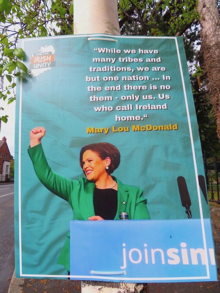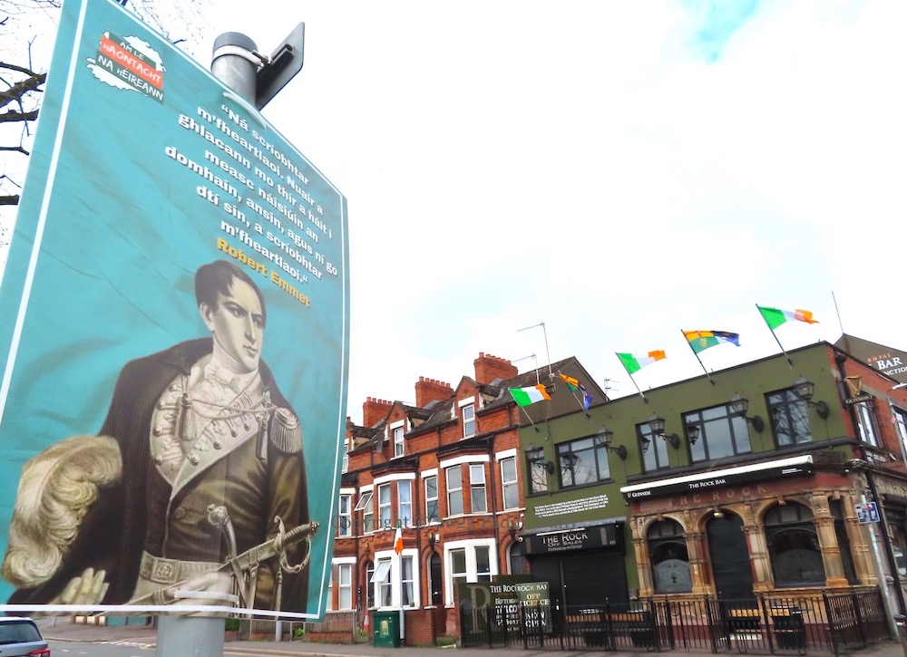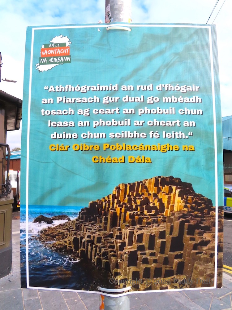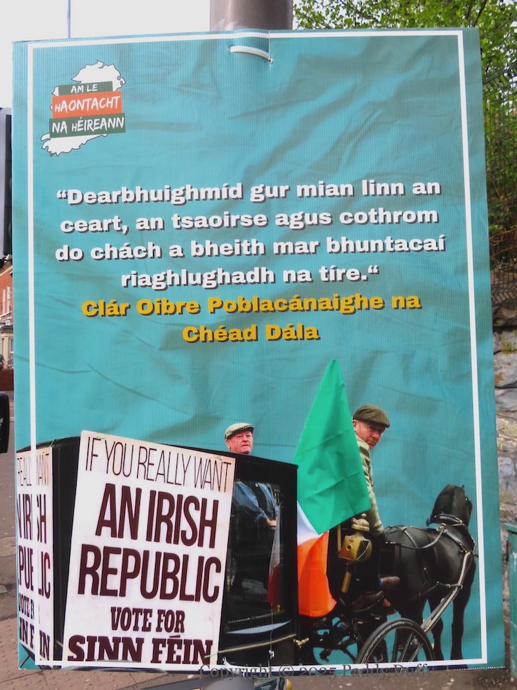 For Sunday’s parade (in Belfast) commemorating the Easter Rising of 1916, Sınn Féın lined the route with placards featuring quotations from republican heroes past and present: the first Dáıl, Wolfe Tone, Robert Emmet, James Fintan Lalor, Roger Casement, the Proclamation of 1916, William Allen, the Declaration Of Independence, James Larkin (as Gaeılge), Máıre Drumm, Rita O’Hare, Martin McGuinness, Mary Lou McDonald, Bobby Sands, O’Donovan Rossa, John O’Mahony, Seán Mac Dıarmada, James Connolly, Liam Lynch, Thomas Clarke, Pádraıg Mac Pıaraıs, Maıréad Farrell, the IRB, Michelle O’Neill, Gerry Adams, Constance Markievicz, Winifred Carney, Na Fíníní.