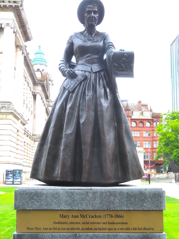 “Mary Ann McCracken (1770-1866) Abolitionist, educator, social reformer and businesswoman. Sheas Mary Ann an fód ar son na mbocht, na mban, na bpáıstí agus ar son sıúd a bhí faoı dhaoırse. [Mary Ann stood up for the poor, women, children, and for those who were enslaved.]”