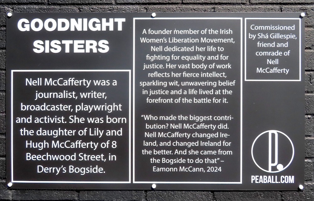 McCafferty died last year (2024) after a long career as a journalist and activist (BBC). “Goodnight, sisters” was her parting phrase at the end of her segments on The Women’s Programme, which aired on RTÉ between 1983 and 1986 (Journal).